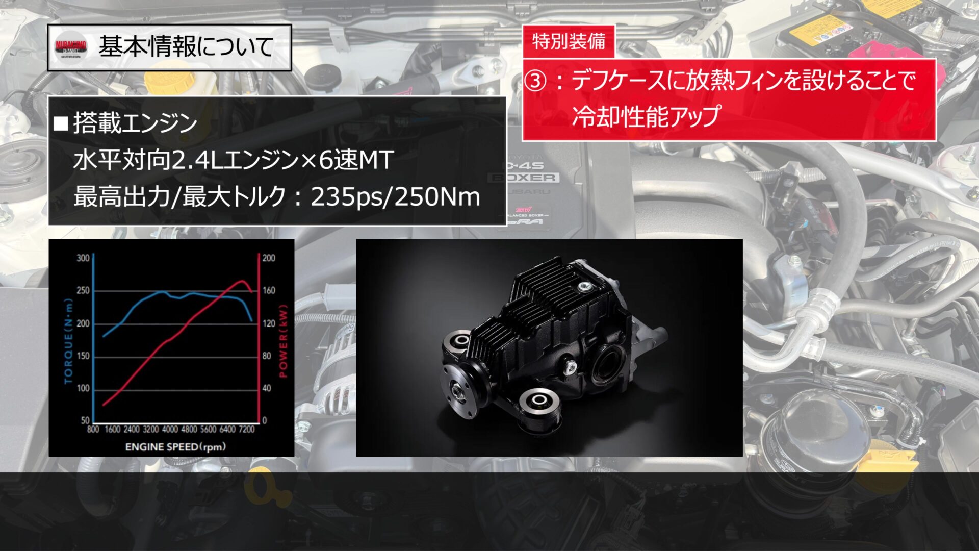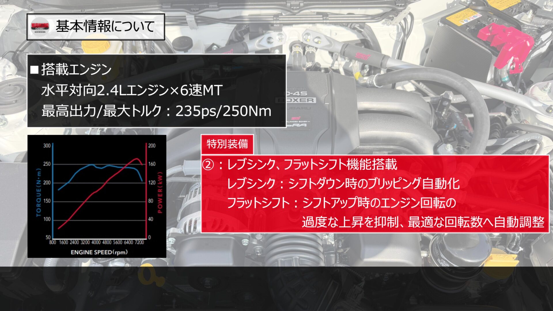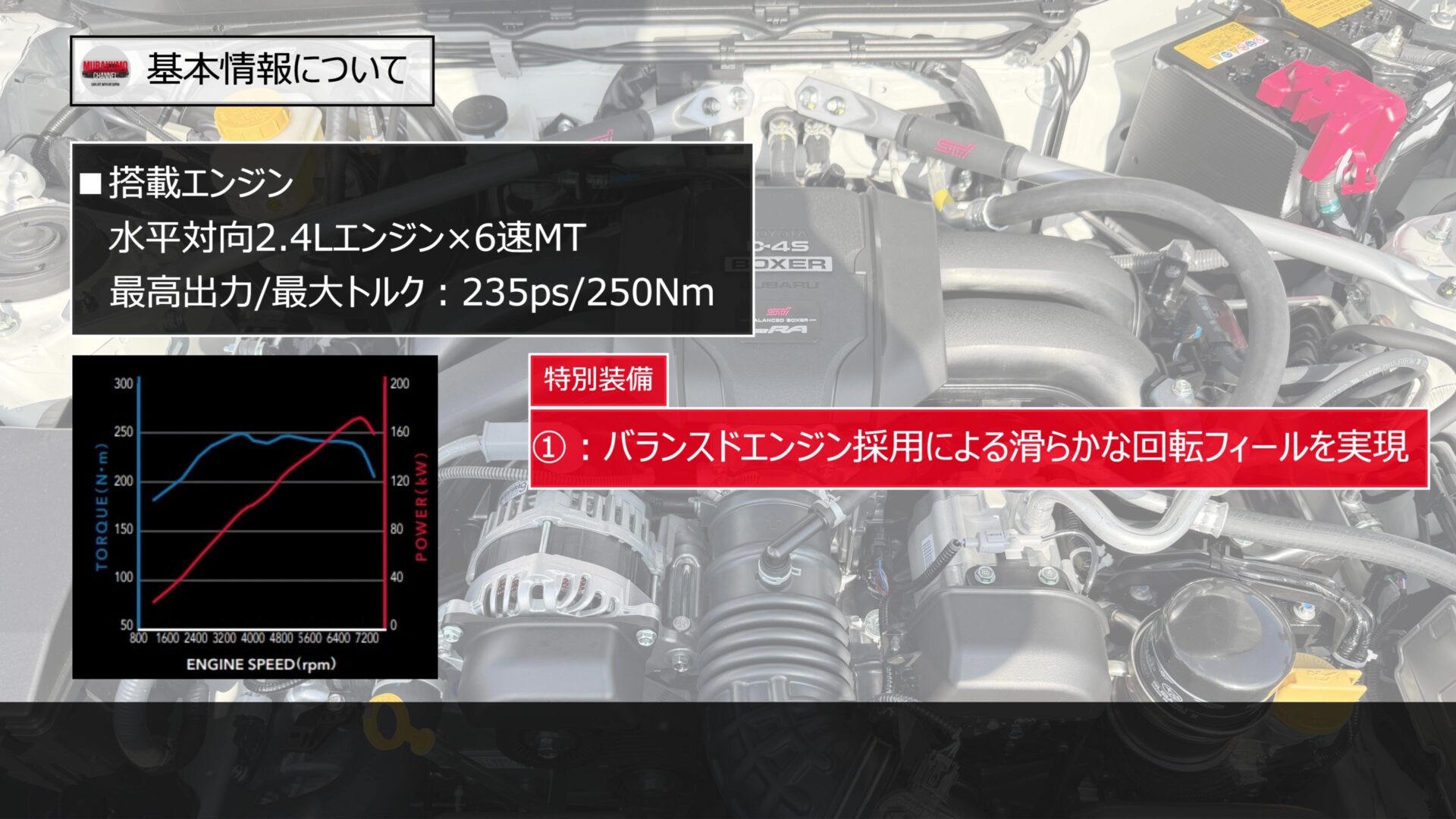 最大出力は235ps、最大トルクは250Nmで、数値上は通常のBRZと同じですが、このモデル最大の特徴は「バランスドエンジン」を採用している点です。これはスーパー耐久シリーズ参戦車両で培われた技術で、ピストンやコンロッド、クランクシャフト、フライホイール、クラッチカバーといったエンジン内部の部品を一つ一つ精密に重量バランス取りすることで、エンジンの振動を徹底的に抑えています。