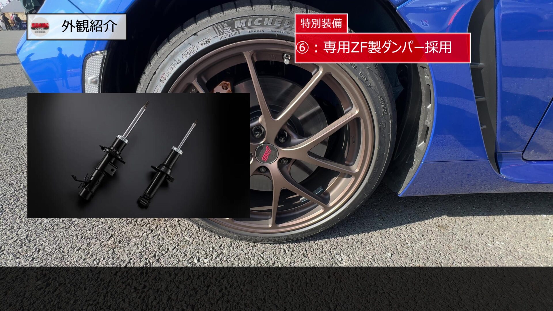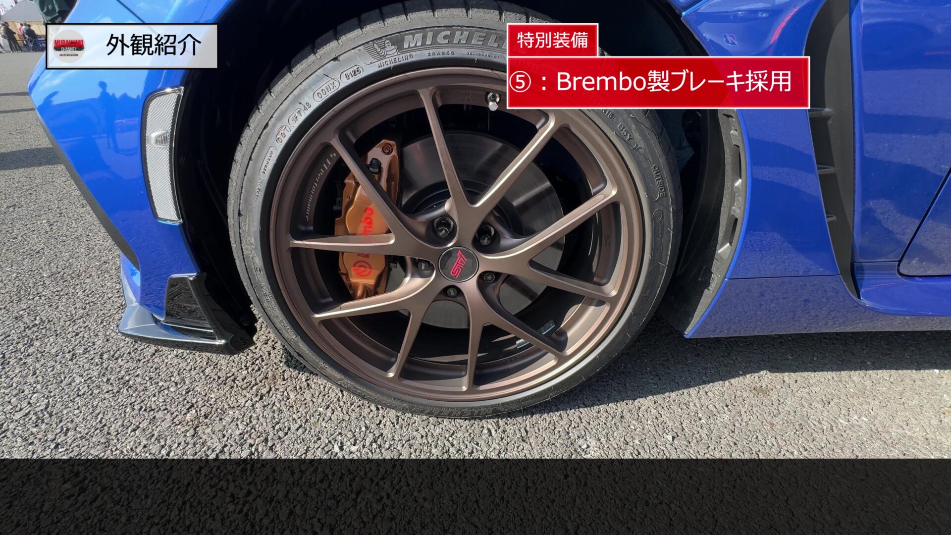 マットグレイは精悍で引き締まった印象、マットブロンズは特別感があり、足元に高級感とレーシーさを両立したカラーです。タイヤはミシュランのパイロットスポーツ4を装着し、サイズは215/40R18となっています。ブレーキも高性能で、brembo製の対向4ポットキャリパーと対向2ポットキャリパーによるベンチレーテッドディスクブレーキが採用されています。キャリパーはゴールド塗装で、スポーツモデルらしい見た目と確かな制動力を両立します。足回りにも特別装備が与えられており、スーパー耐久シリーズで培った知見を活かした専用ZF製ダンパーとSTI製フレキシブルパーツを採用することで、
