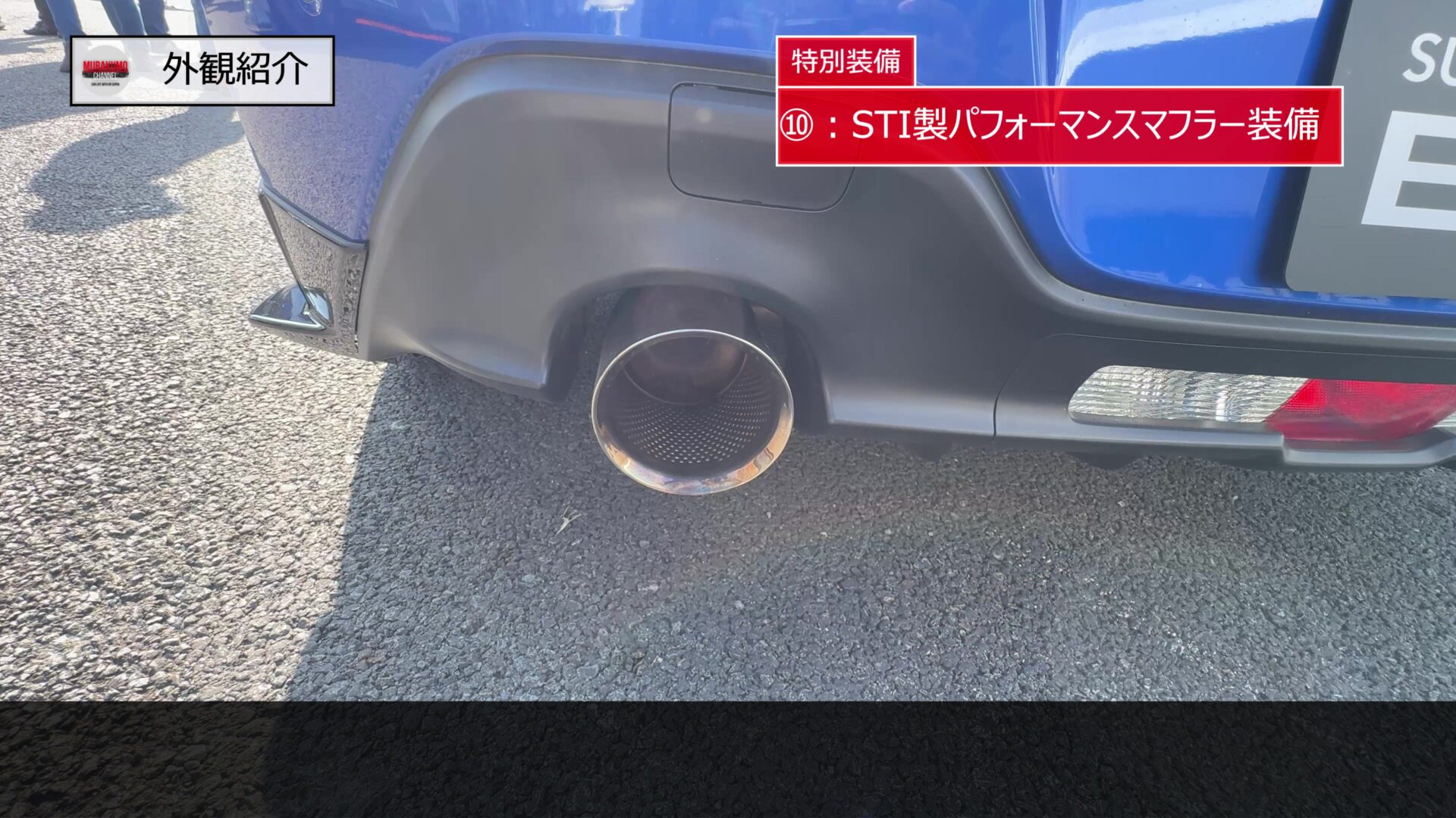 マフラーは左右2本出しのデュアルエキゾーストで、STI製パフォーマンスマフラーが標準装備されています。見た目は大径のテールエンドが特徴的で、サウンドもスポーティにチューニングされています。