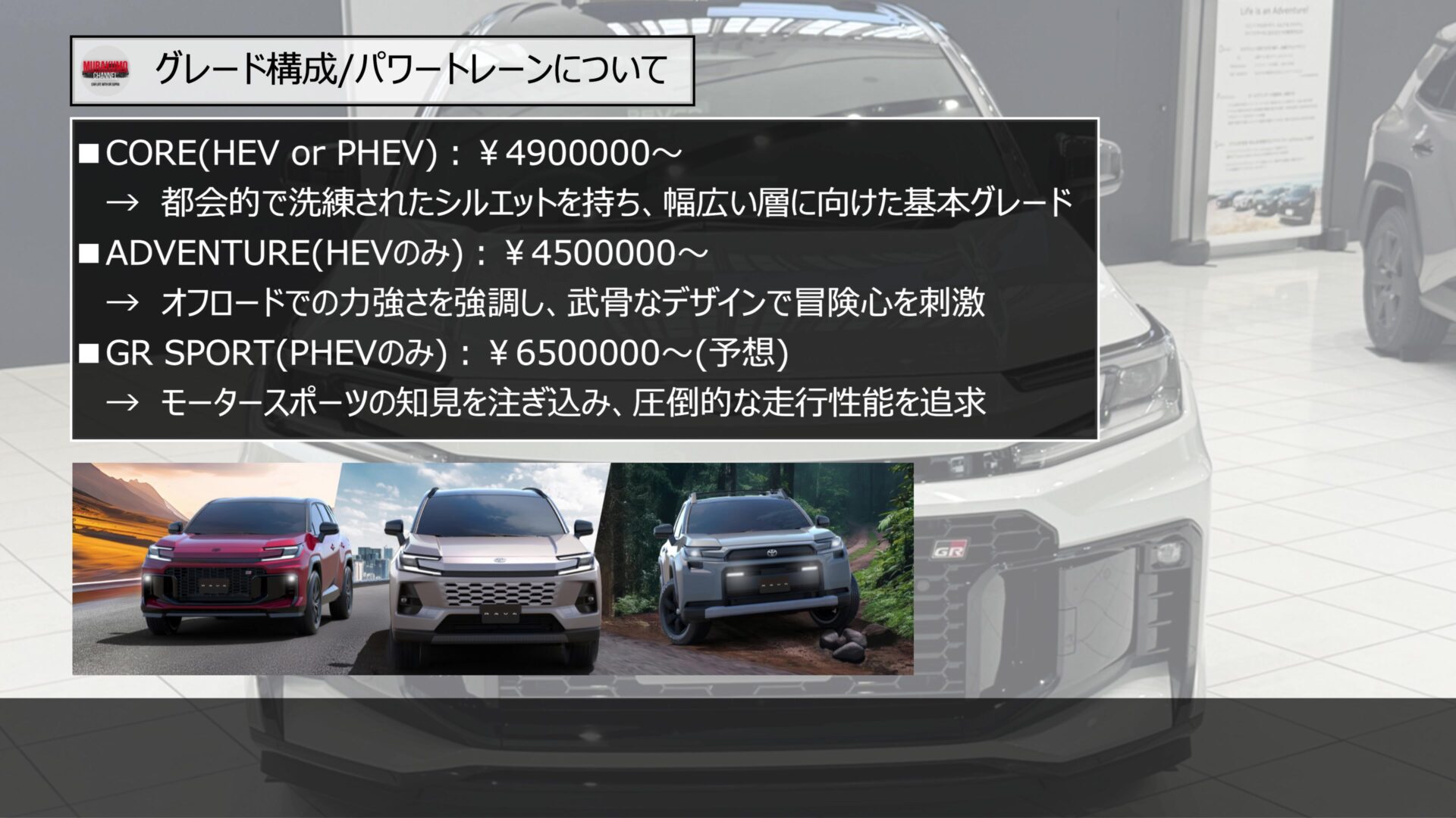 新型RAV4のグレード構成は、ユーザーの多様なライフスタイルに合わせて、個性の異なる3つのスタイルを軸に展開されます。