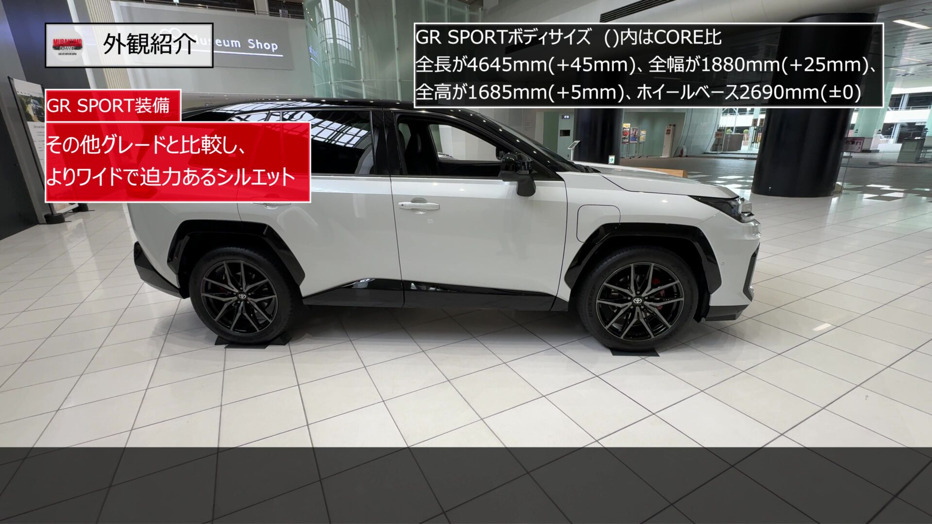 サイドのデザインはこのようになっており、新型RAV4の基本寸法は、全長が4645mm、全幅が1880mm、全高が1685mm、ホイールベースは2690mmとなっています。特筆すべきはGR SPORTの堂々としたサイズ感です。標準的なモデルよりも全長が45mm長く、全幅が25mm拡大されています。