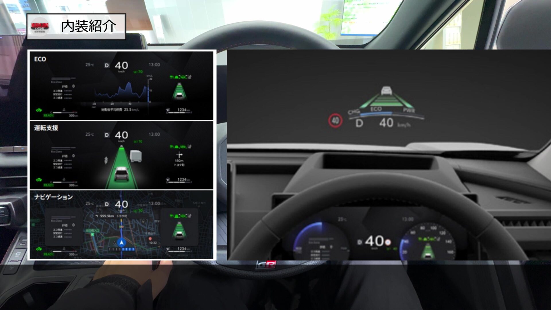 例えば中央に大きな地図を表示したり、燃費情報やエネルギーフローを表示したりと、カスタマイズの自由度が非常に高くなっています。さらに、カラーヘッドアップディスプレイも刷新され、情報の認識性を高めるために、従来の表示から遠近感を活かした斜め表示へと変更されました。これにより、視線を大きく動かすことなく重要な情報を把握し続けることができます。