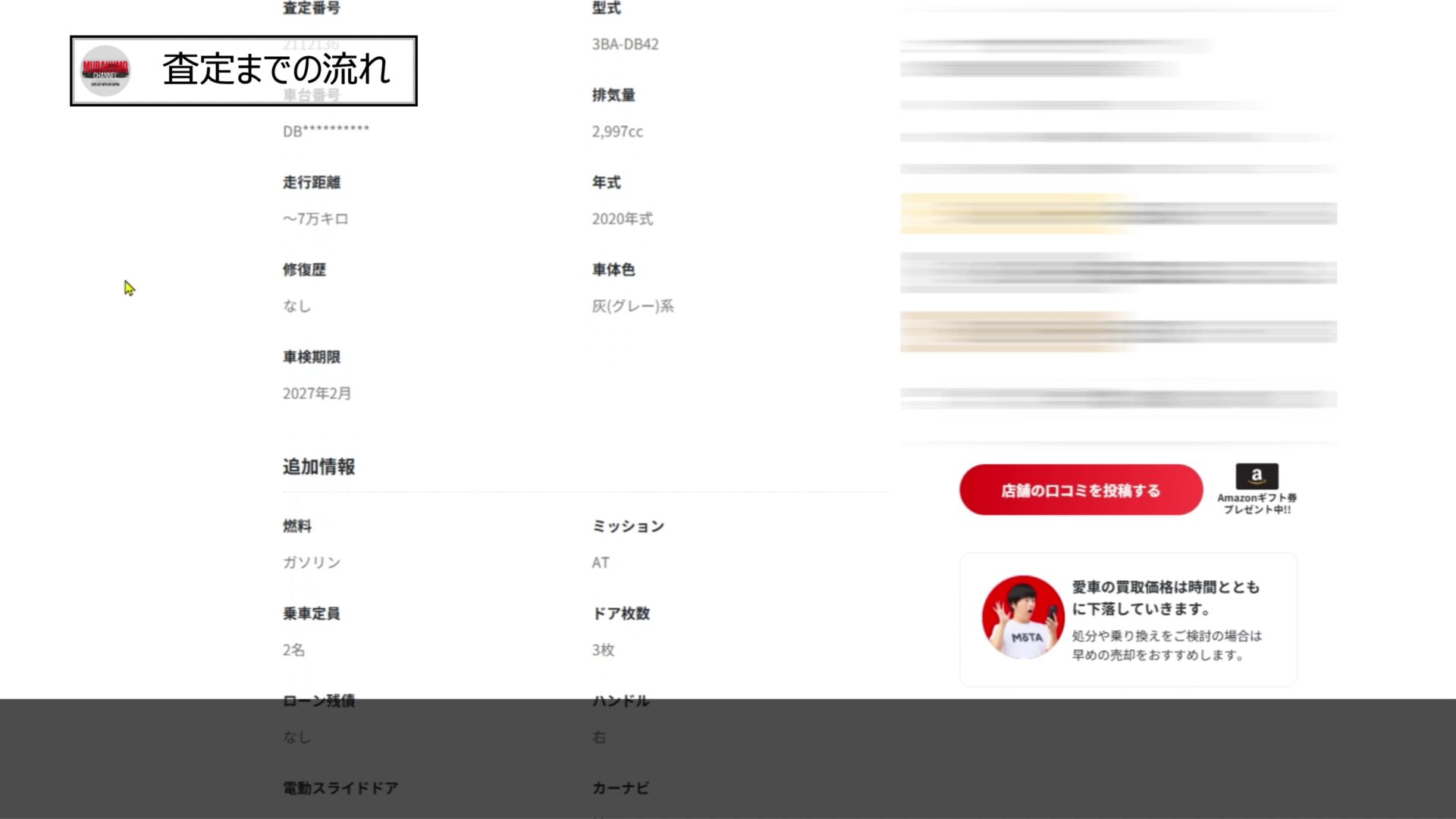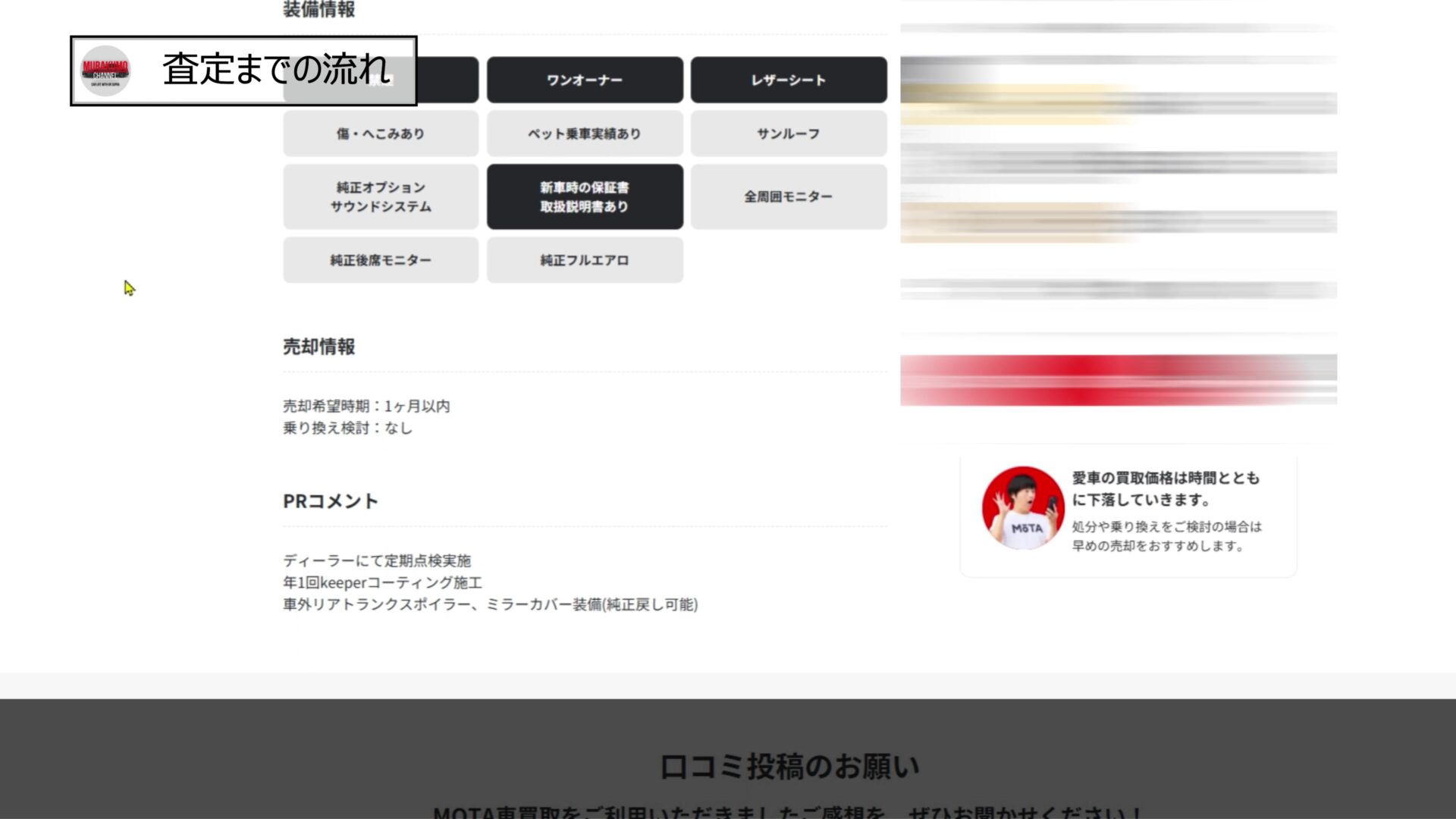 私の場合はメンテナンスの仕方としてディーラーにて定期的にお世話になっていたことや年に1回keeperコーティングを実施していたことに加えて、先ほど申し上げたカスタムの内容も加えて記載しておきました。この欄はなるべく正直な情報を充実すべきかと思います。