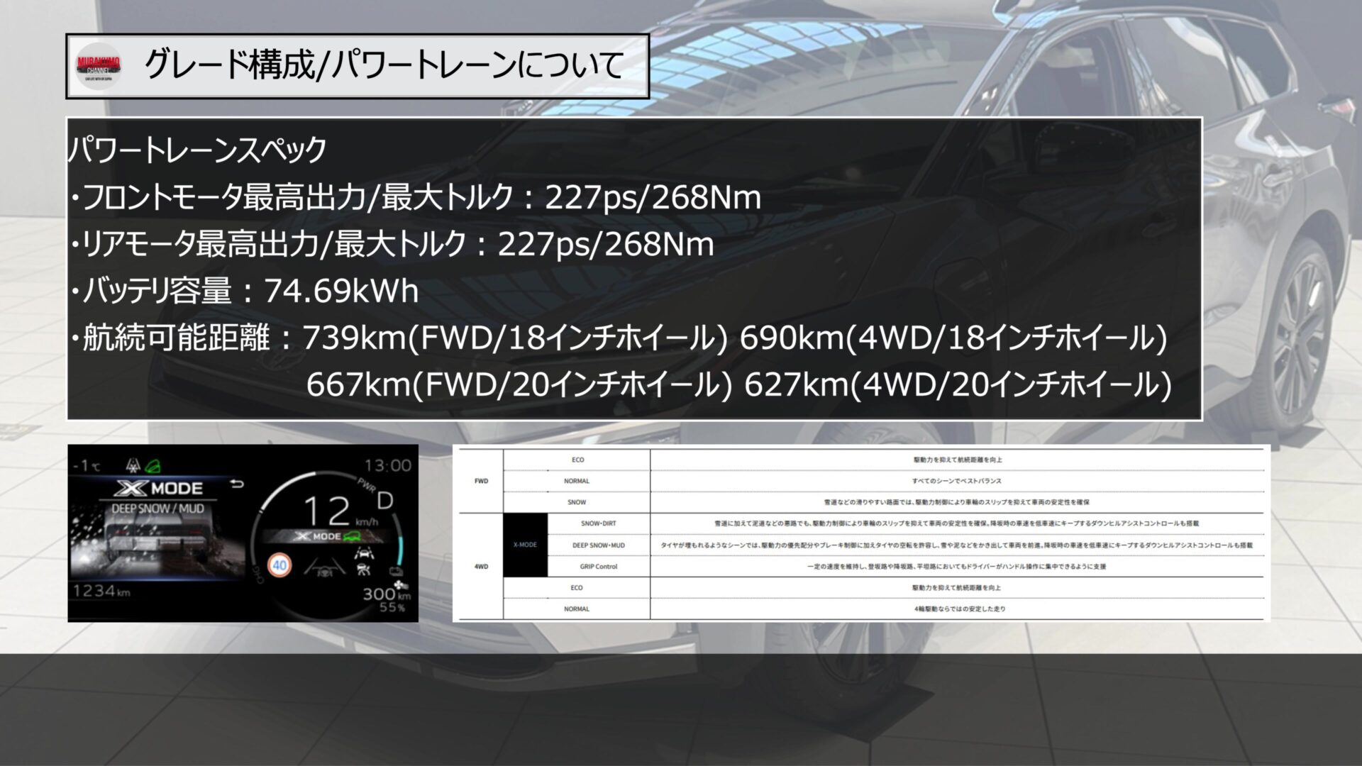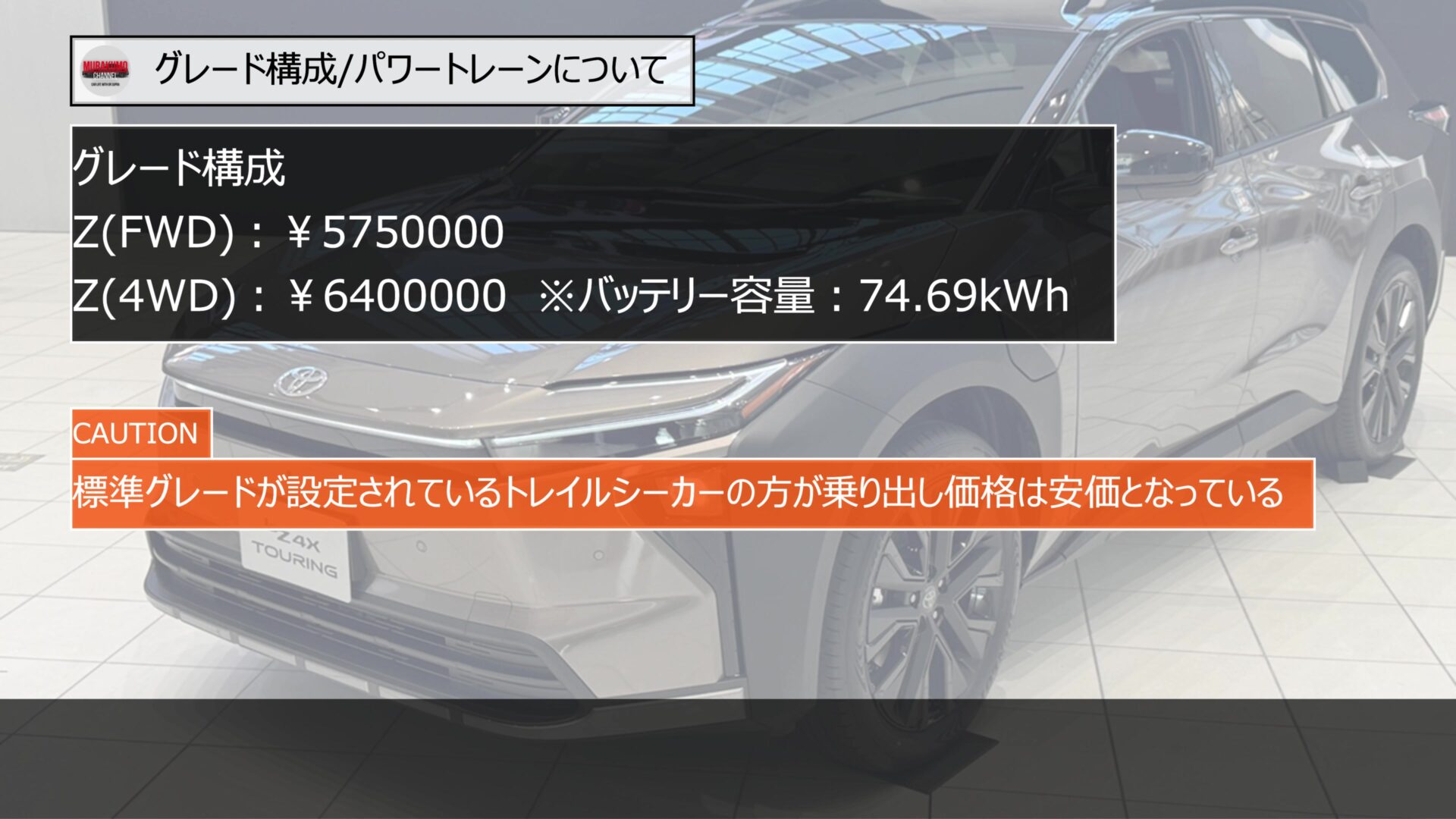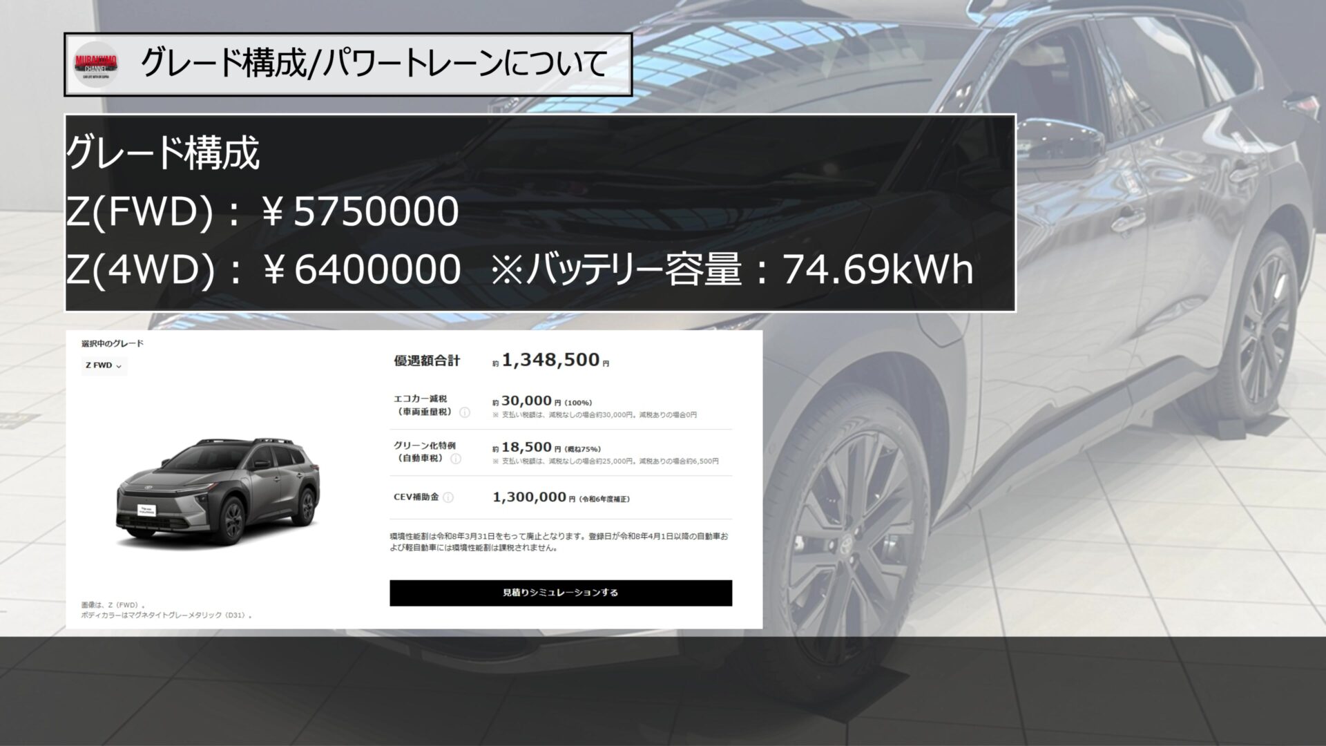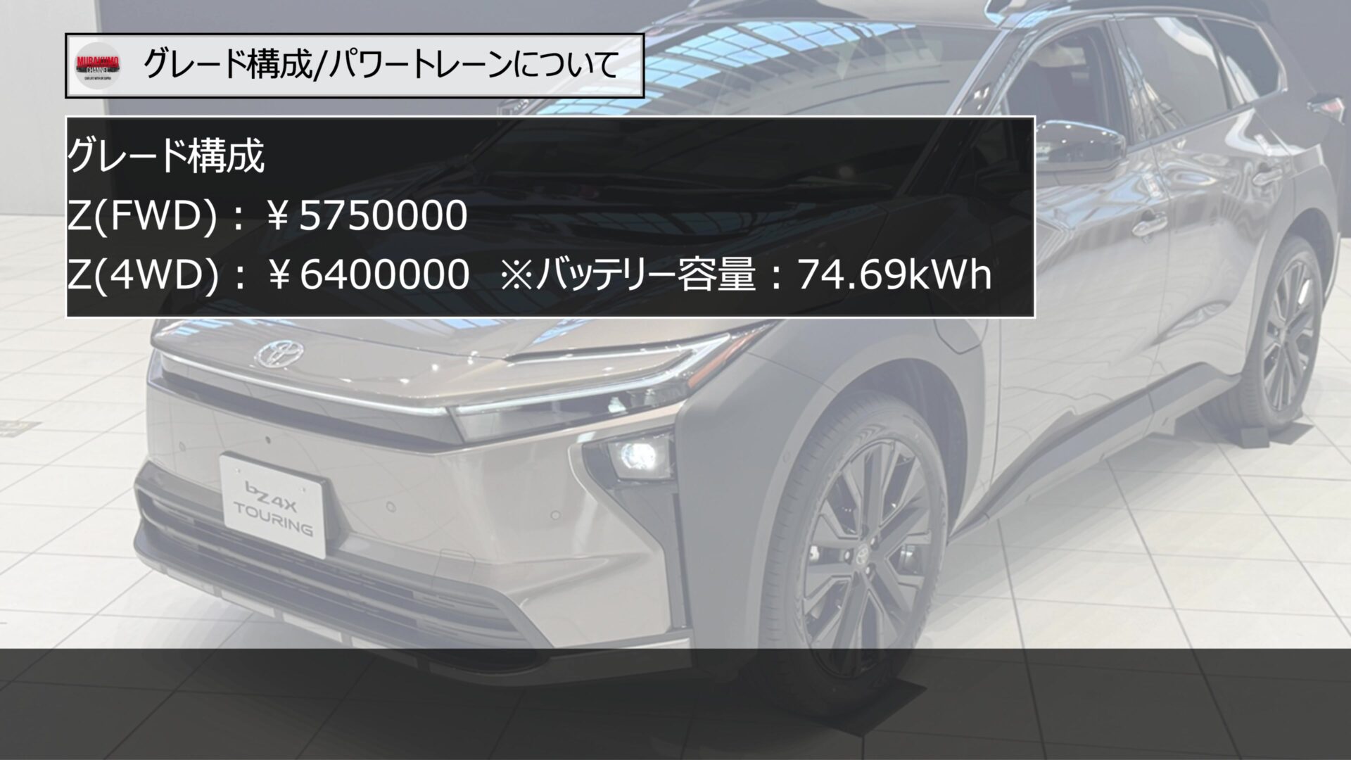 メーカー希望小売価格は、消費税込みで前輪駆動モデルが5,750,000円、4WDモデルが6,400,000円という設定になっています。標準モデルのbZ4XのZグレードと比較すると、FWDで250,000円、4WDで400,000円、それぞれ価格がアップしています。一見すると高価に感じられるかもしれませんが、後ほど紹介するパワートレーンの出力向上や、14インチの大型ディスプレイオーディオ、JBLプレミアムサウンドシステムなどの豪華装備が、すべて標準で組み込まれていることを考慮すると、非常に戦略的な価格設定であると分析できます。