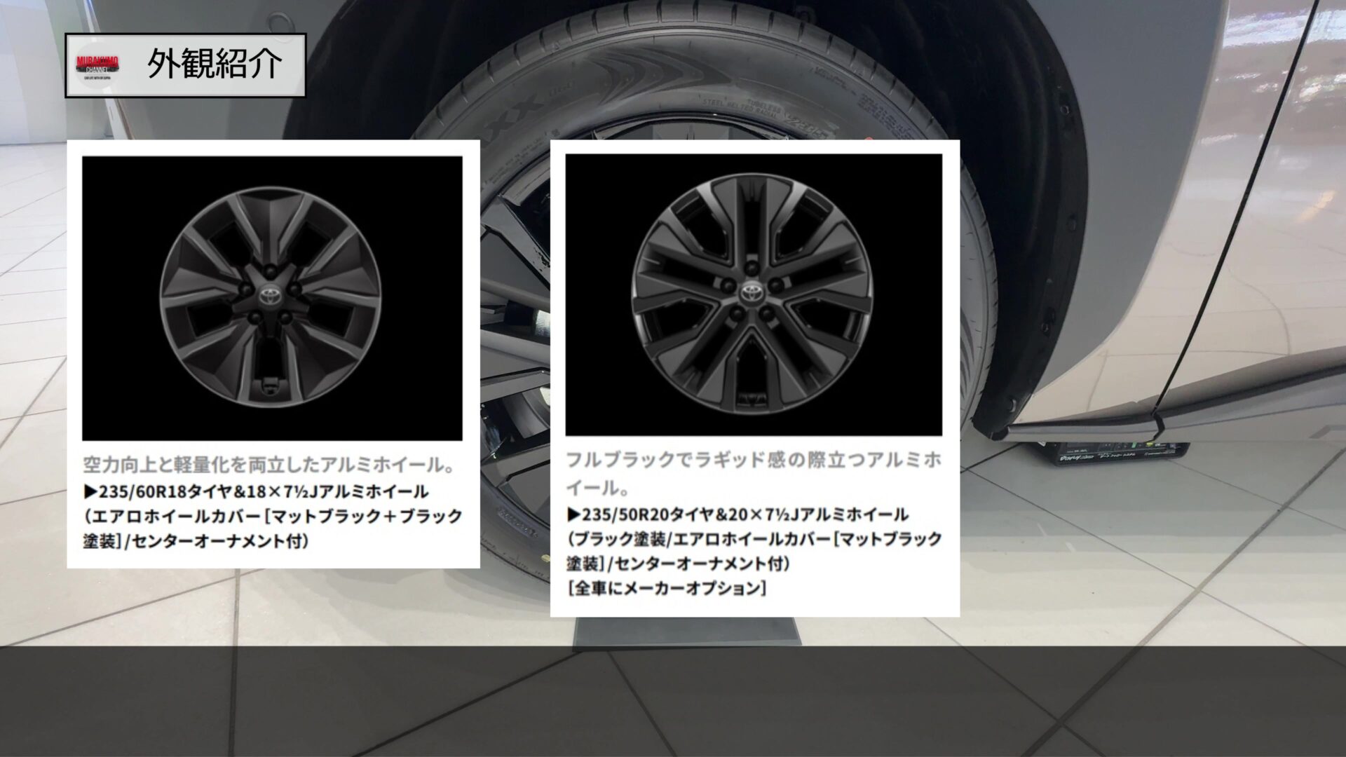 ホイールデザインについてはこのようになっており、標準装備される235/60R18タイヤと、18インチアルミホイールは、マットブラックとブラックを組み合わせたエアロホイールカバーが装着され、空力性能の向上と軽量化を両立させています。