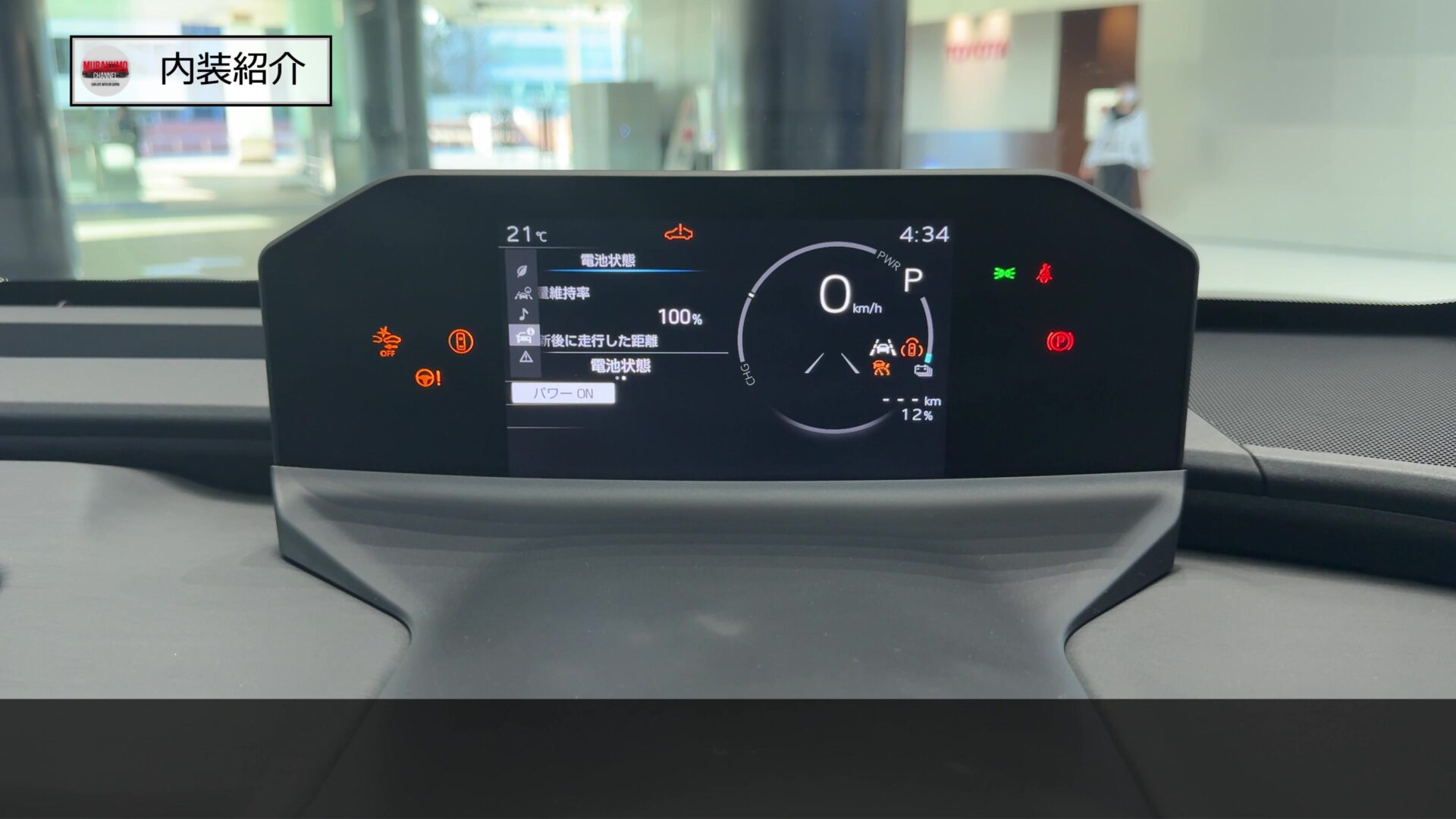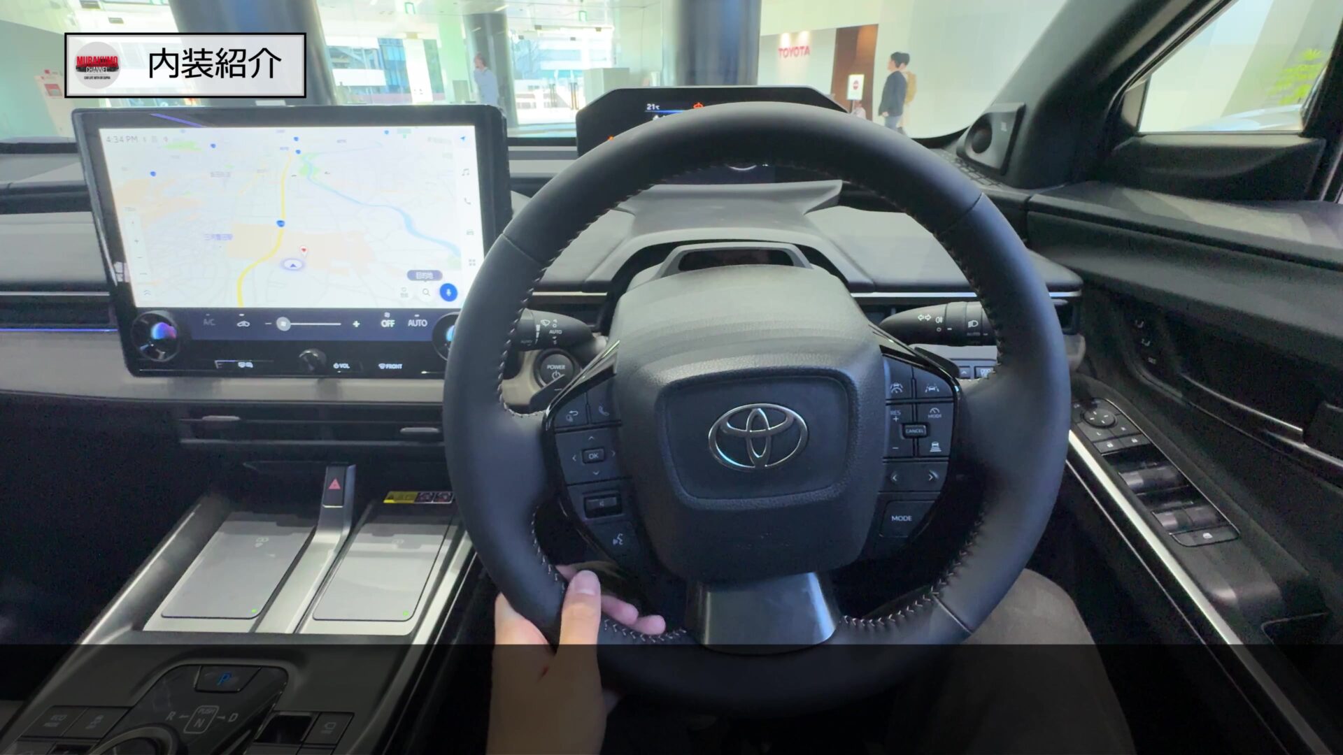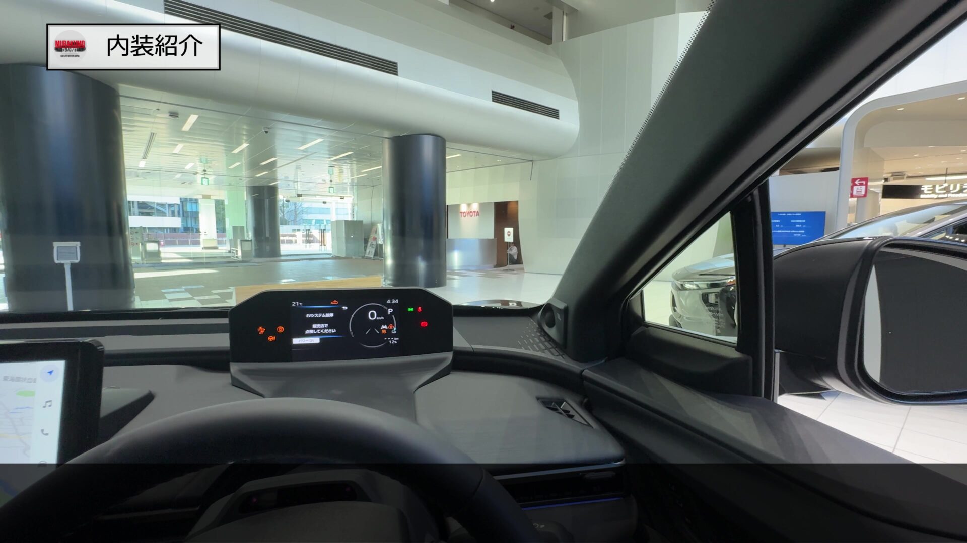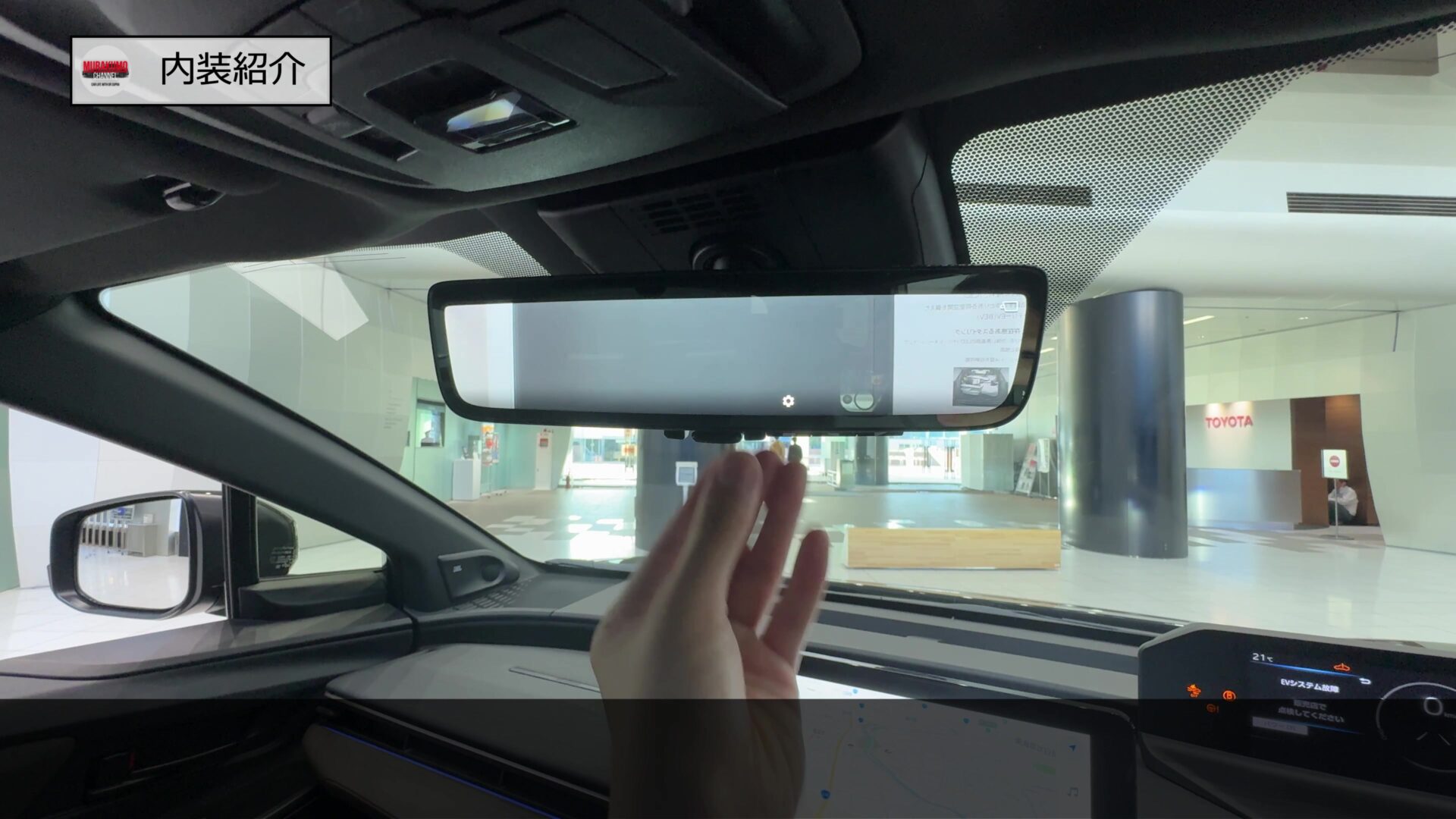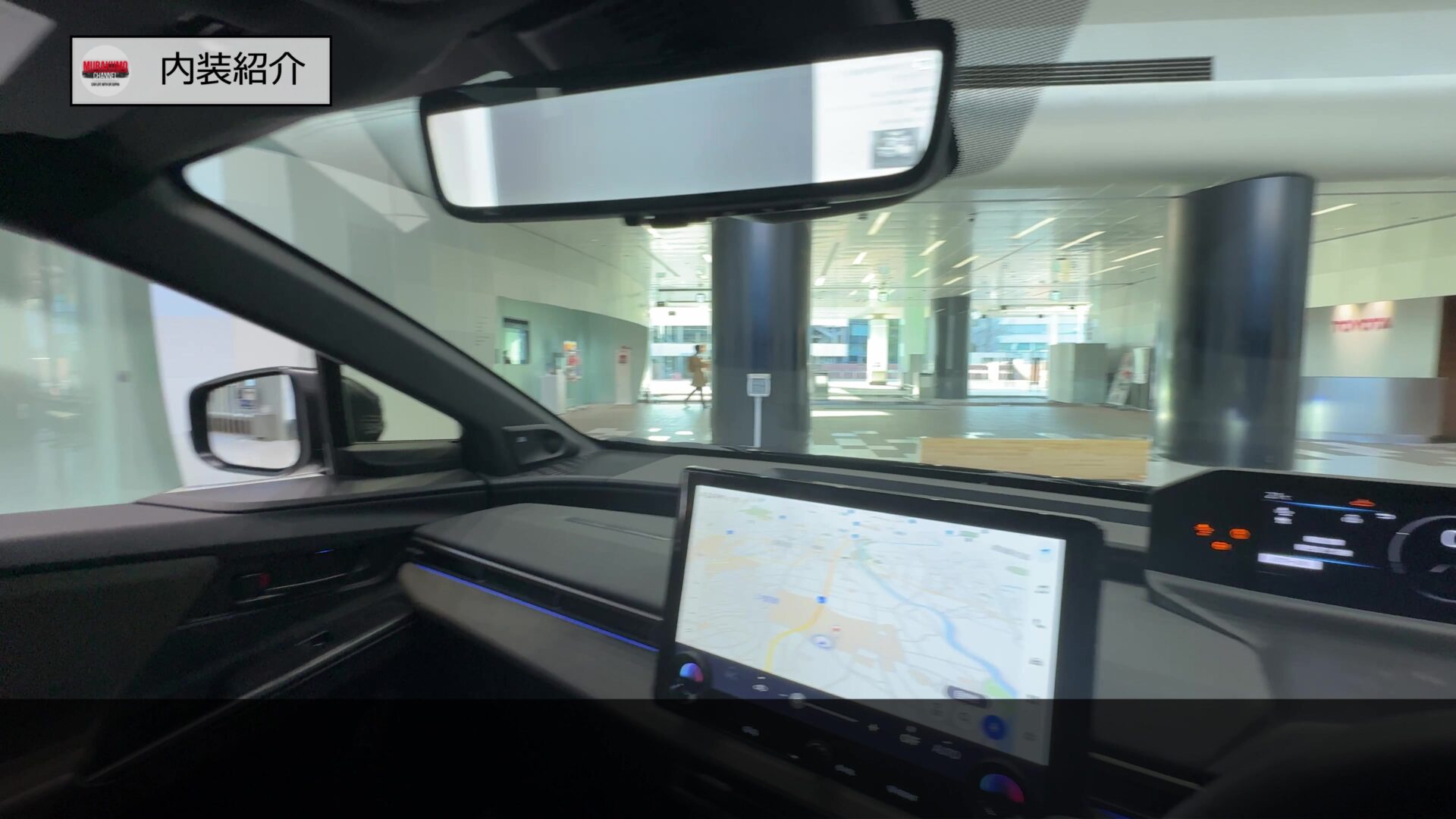 運転席からの視界はこのようになっており、ドアミラーとAピラー周辺の視界も少なく、標準モデルのbZ4Xに対してよりCピラーの傾斜が緩やかになっているツーリングではより視界は確保されています。ボンネットの両端も視界にとらえることができましたので車両感覚も比較的つかみやすいのではないかと思います。加えて車両後方の映像をルームミラーに投影し、より広範囲の視界を確保するデジタルインナーミラーの機能が標準装備となっています。