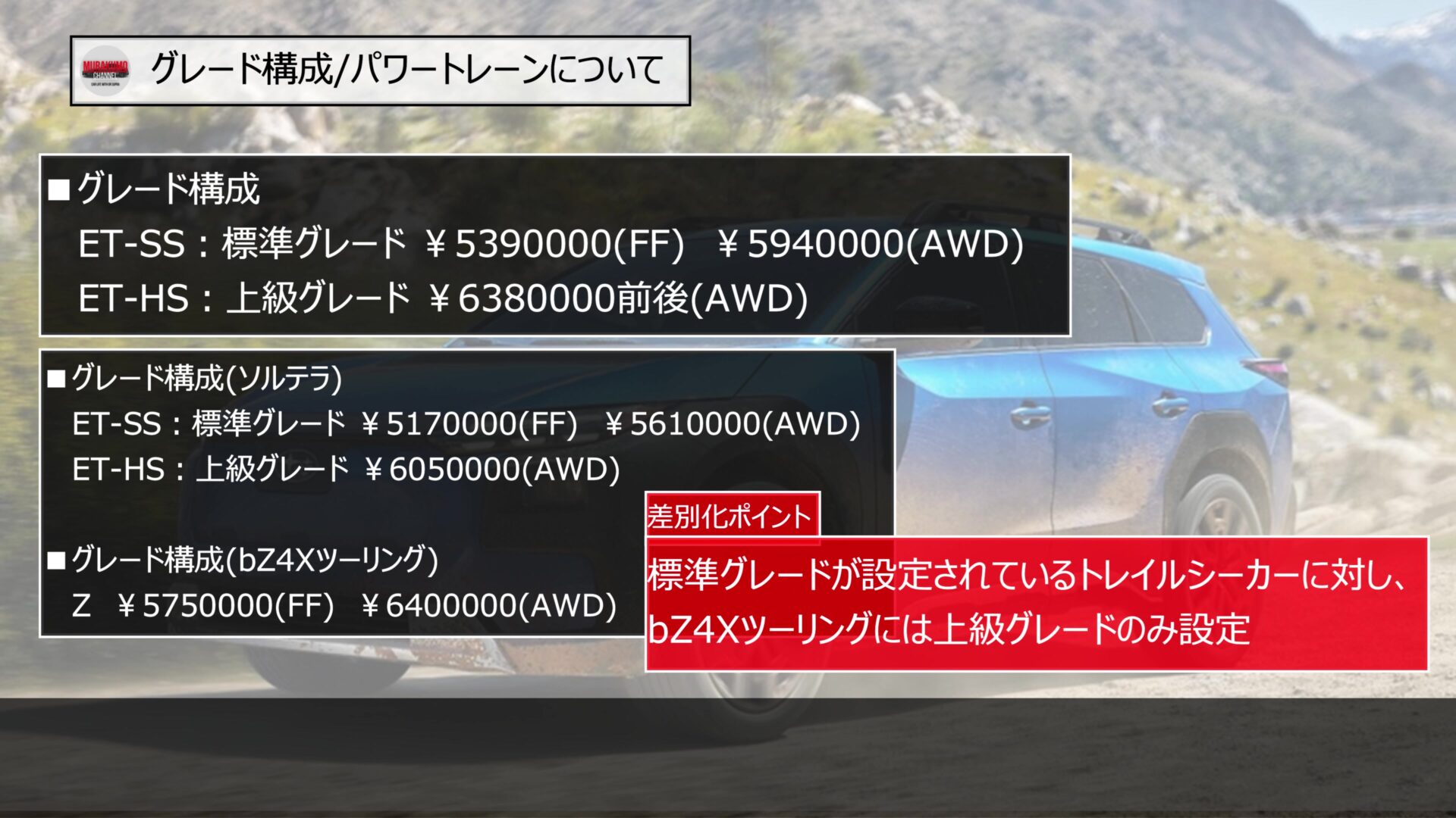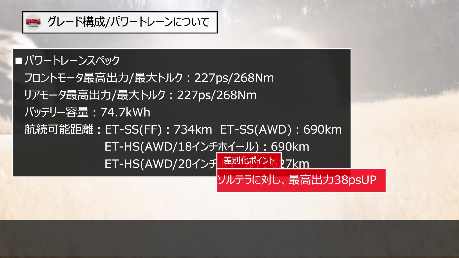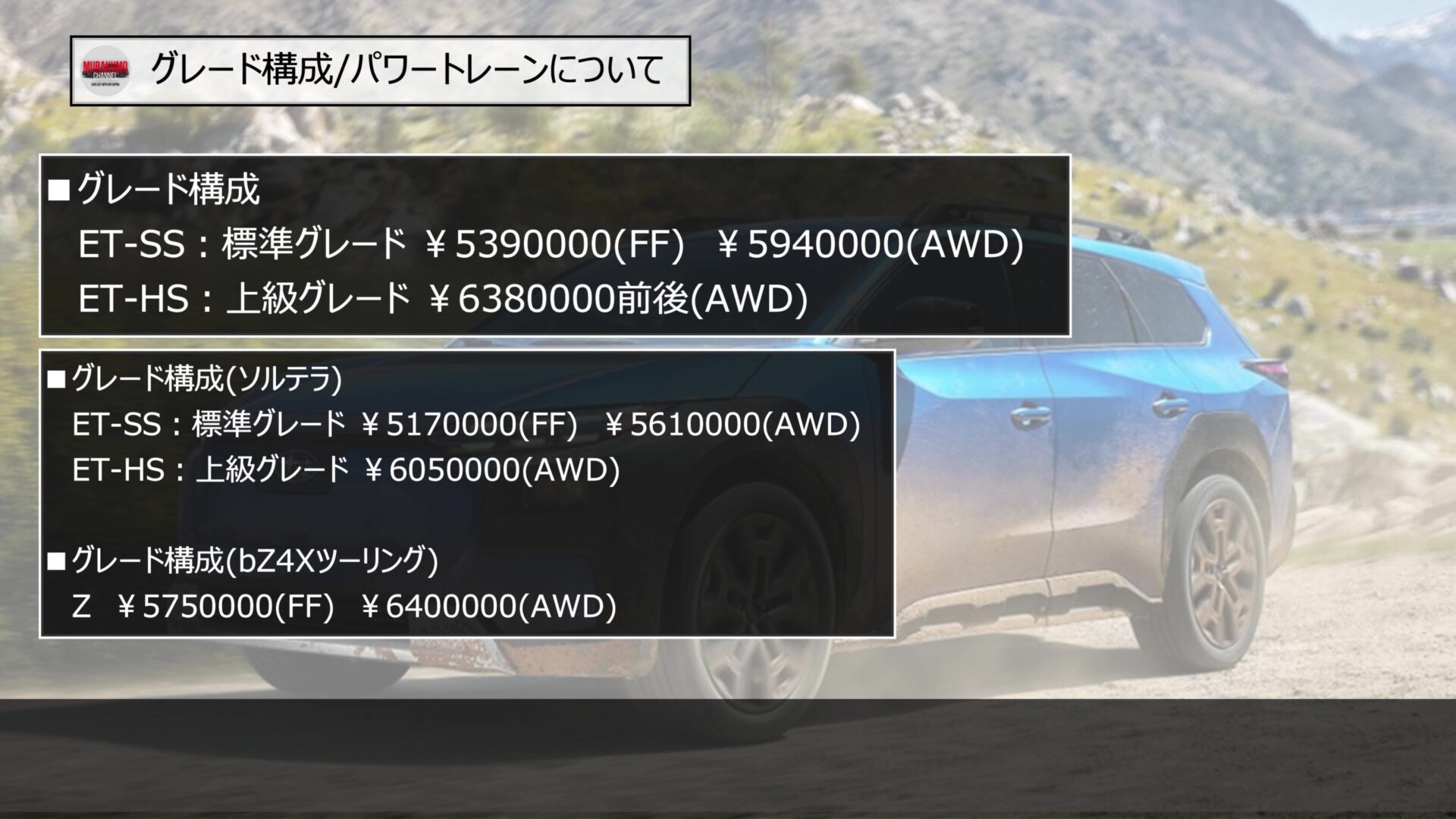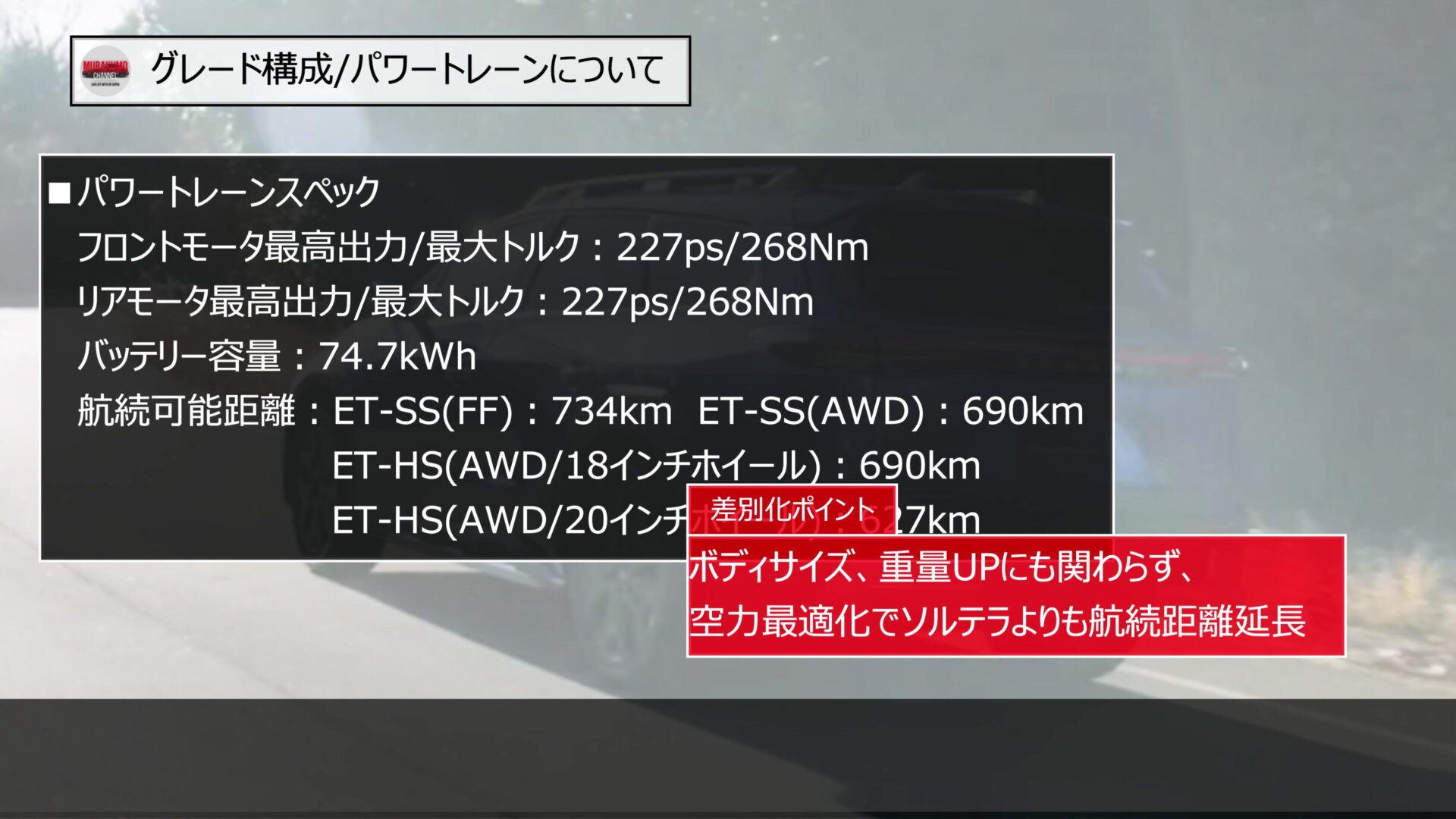 価格設定については、ソルテラの既存モデルよりも、上位のポジショニングとなっており、グレードで駆動方式によって若干異なりますが、おおよそ20万円から30万円アップとなっています。しかし、後に説明するリヤモーターの大幅な出力向上や、荷室空間の拡大、さらには最新世代の安全装備が標準化されていることを考えれば、その上昇分は十分に納得できる内容です。