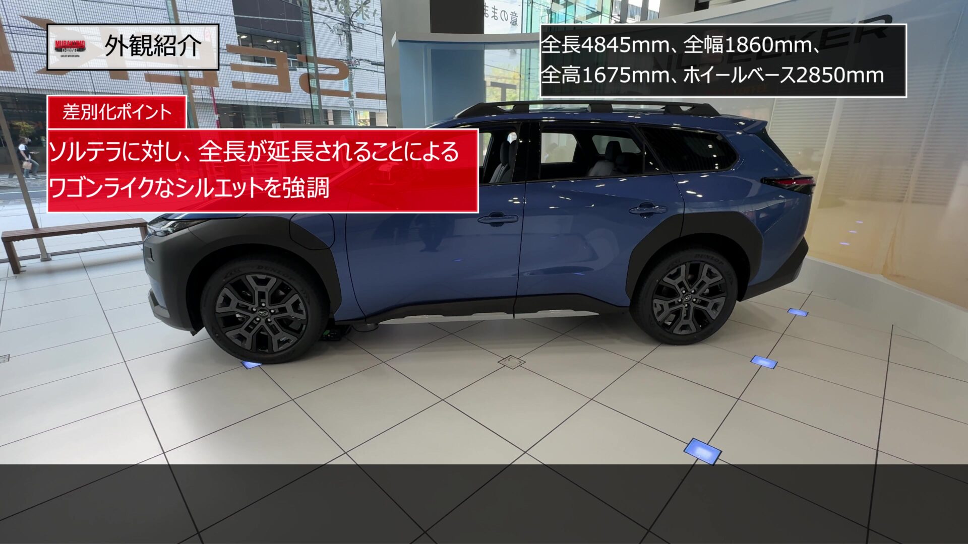 サイドのデザインはこのようになっており、ボディサイズは全長4845mm、全幅1860mm、全高1675mmとなっており、ソルテラと比較して全長が155mm延長されています。