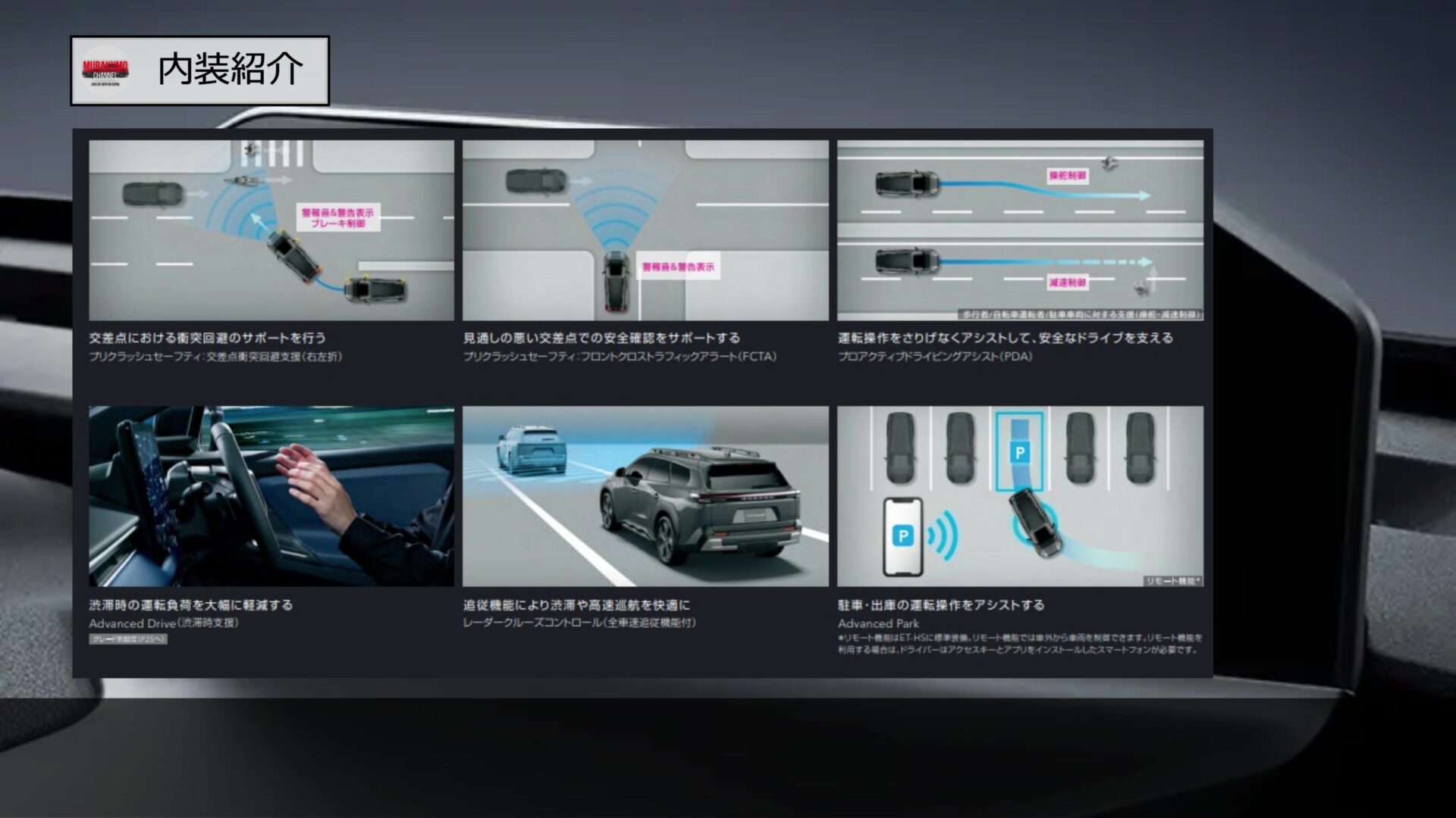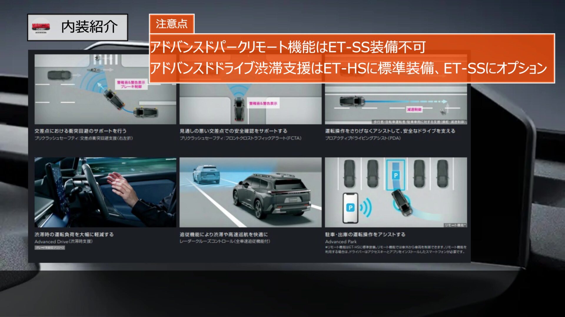 ただ、アドバンスドパークのリモート操作はET-SSには装備不可、アドバンスドドライブ渋滞支援機能はET-HSのみ標準装備となっており、ET-SSではオプション装備となっています。