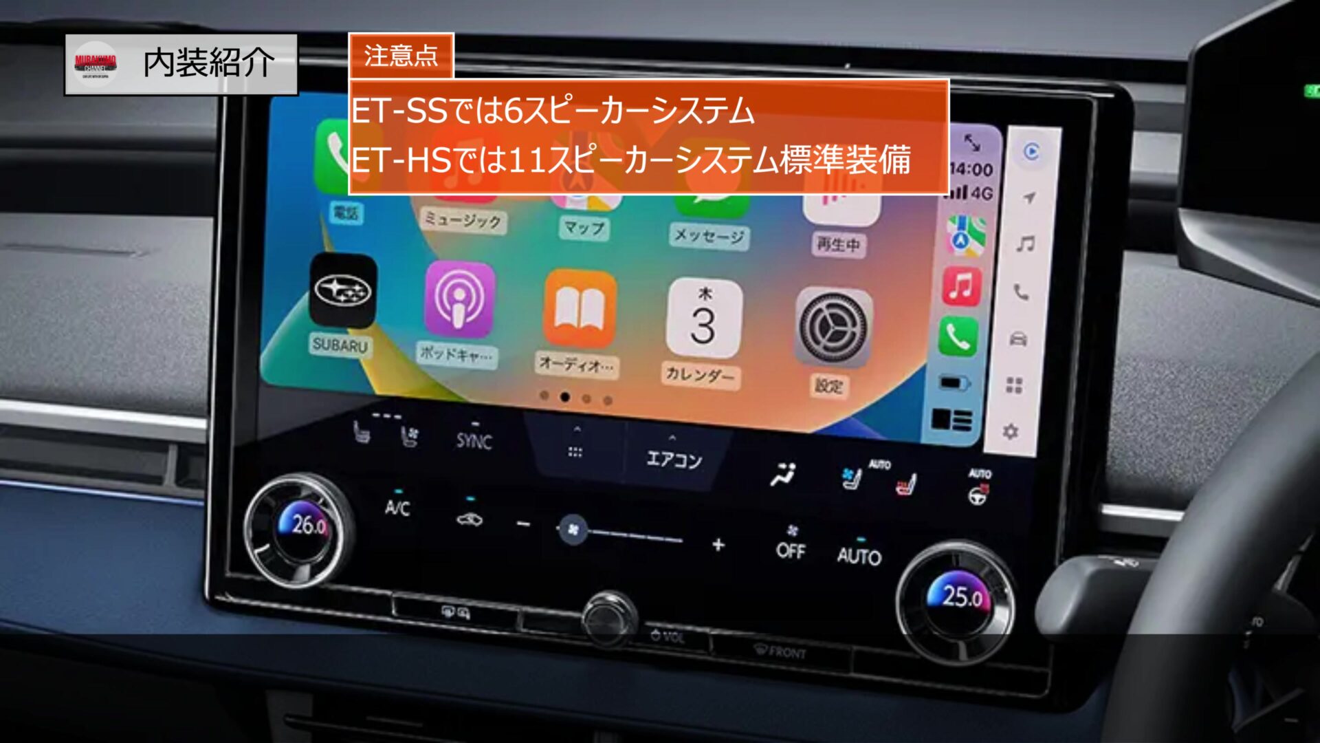 この14インチ大型ディスプレイは全車に標準装備で、画面は高精細で地図も見やすく、画面分割表示にも対応しており、ナビ案内とオーディオ情報などを同時に表示できます。スマートフォン連携機能としてApple CarPlayやAndroid Autoにも対応しており、スマホの地図アプリや音楽ストリーミングを車載画面で利用することもできます。