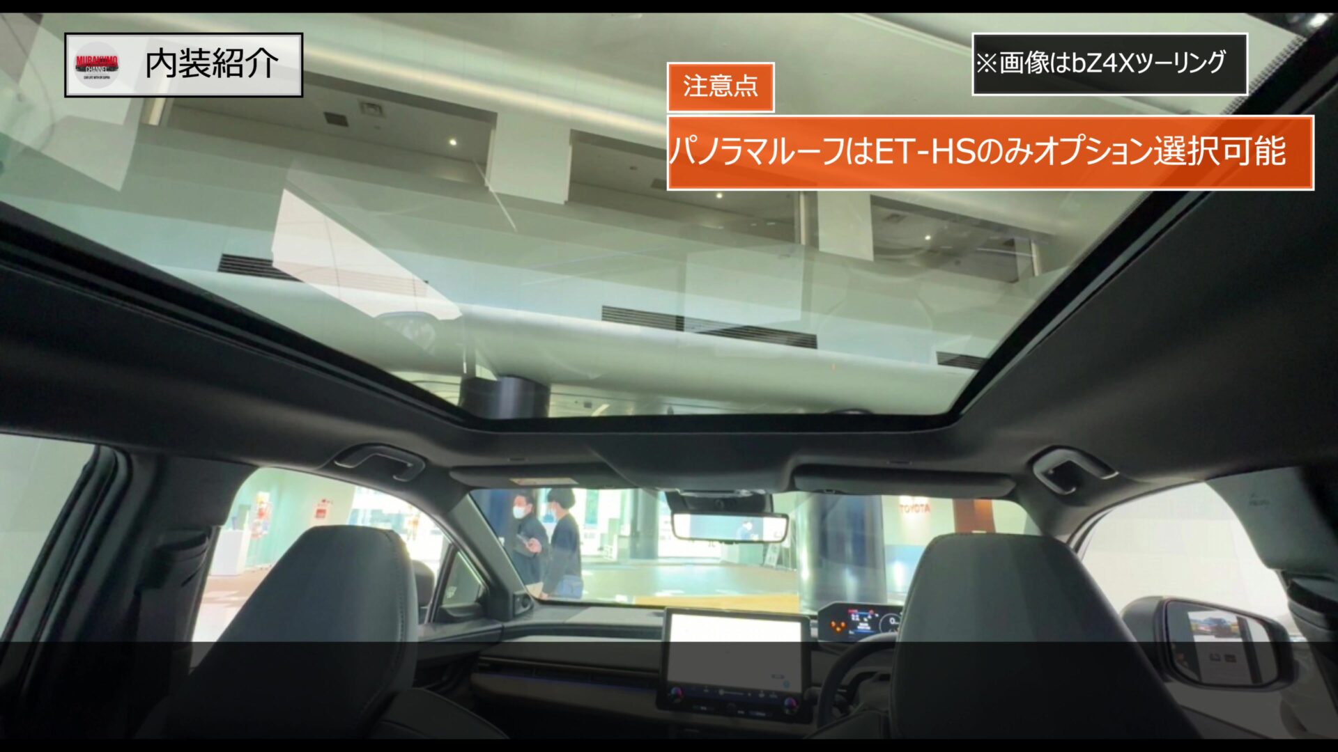 また快適装備としてご覧のパノラマルーフがオプション設定されています。非常に採光面積が広く、後席の開放感がかなり向上する装備であるため、ぜひ選択したいオプションとなっていますが、選択できるのはET-HSのみとなっており、ET-SSには装備できない点は残念です。こちらの装備はbZ4Xツーリングでは標準装備となっており、トレイルシーカーとの差別化ポイントとなっています。