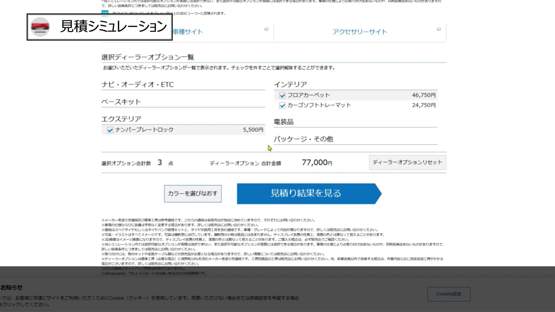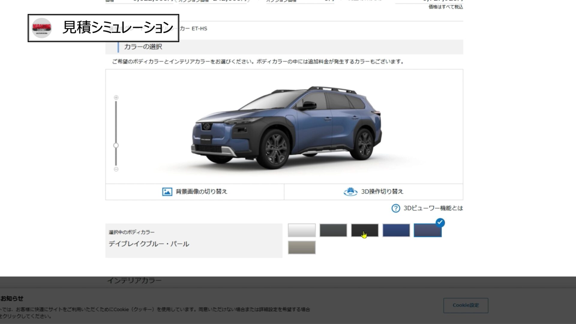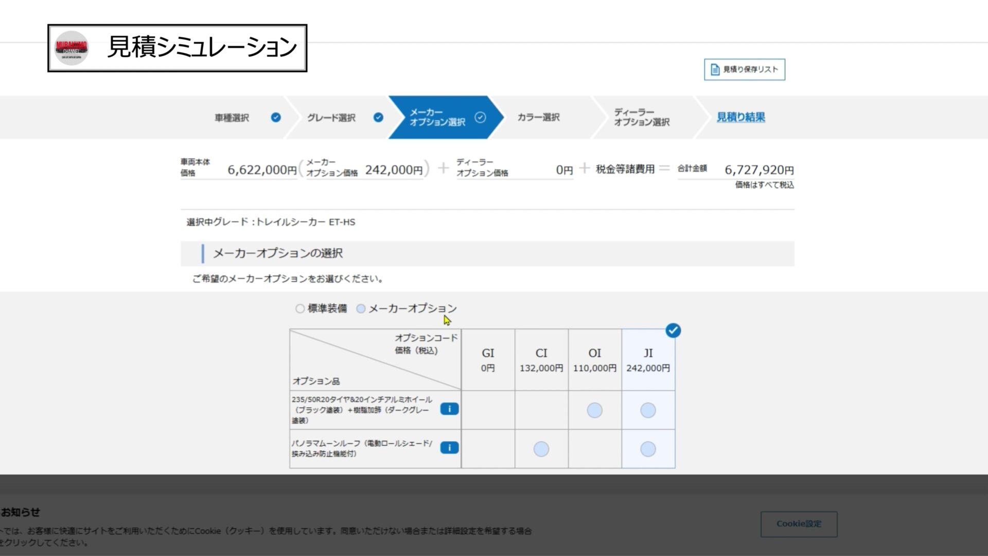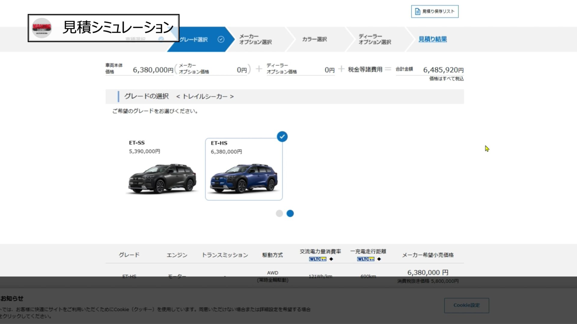 グレードは上級グレードのET-HSを選択し、ボディカラーはブルー系のデイブレイクブルーを選択、ボディカラーで有償なのはホワイトのみですね。インテリアカラーはブルー一択となっています。メーカーオプションとして20インチホイールとパノラマルーフを選択し、ディーラーオプションとしては最低限となるナンバープレートとフロアマットのみを選択すると合計金額は約680万円となりました。