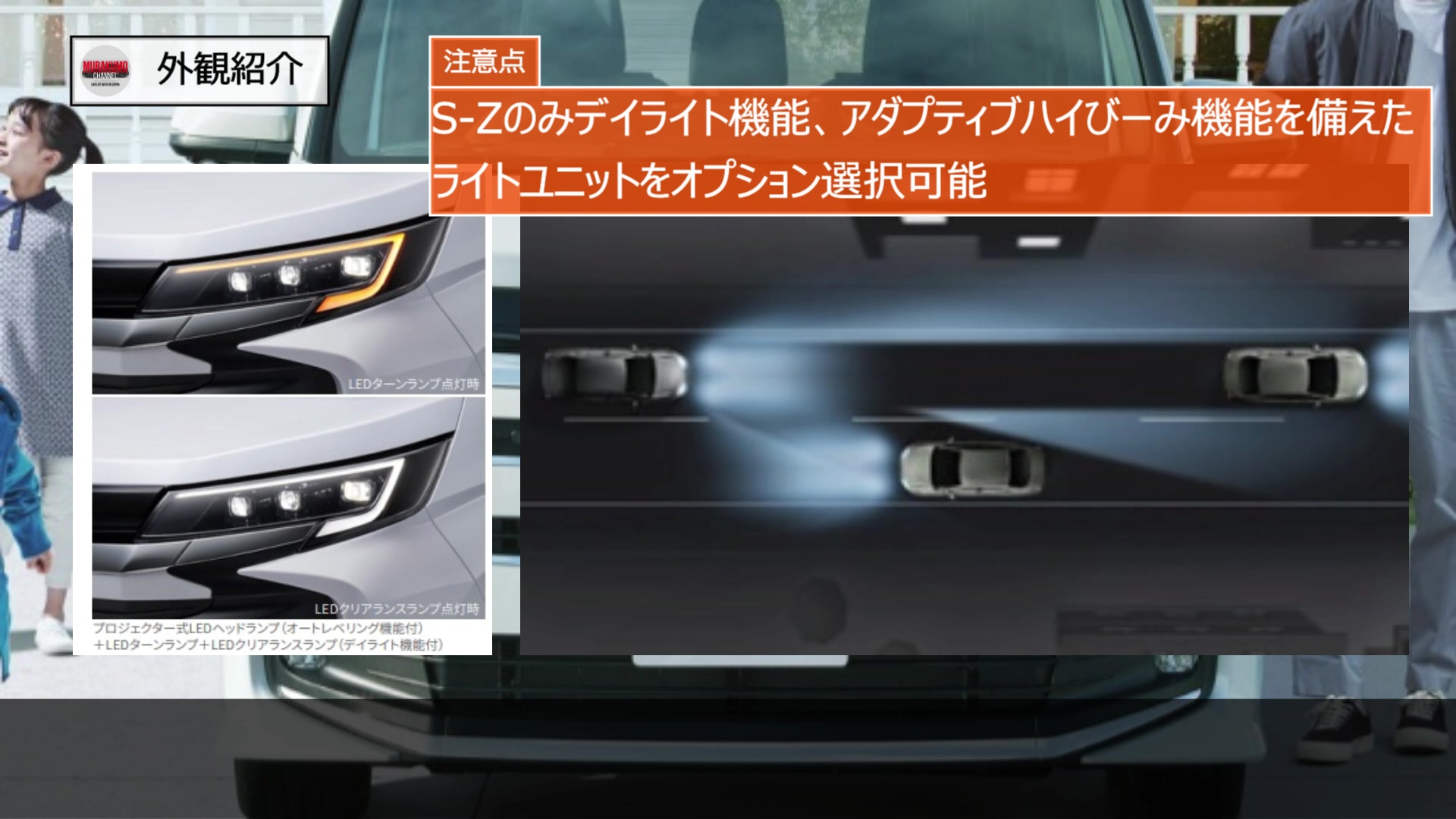 全車にプロジェクター式LEDヘッドランプが標準装備され、そのうえでS-Zグレードにはメーカーオプションでオートレベリング機能やデイライト機能、対向車を検知し、自動的にハイビームを防眩するアダプティブハイビーム機能などのさらに高度なライトユニットがオプション設定されています。