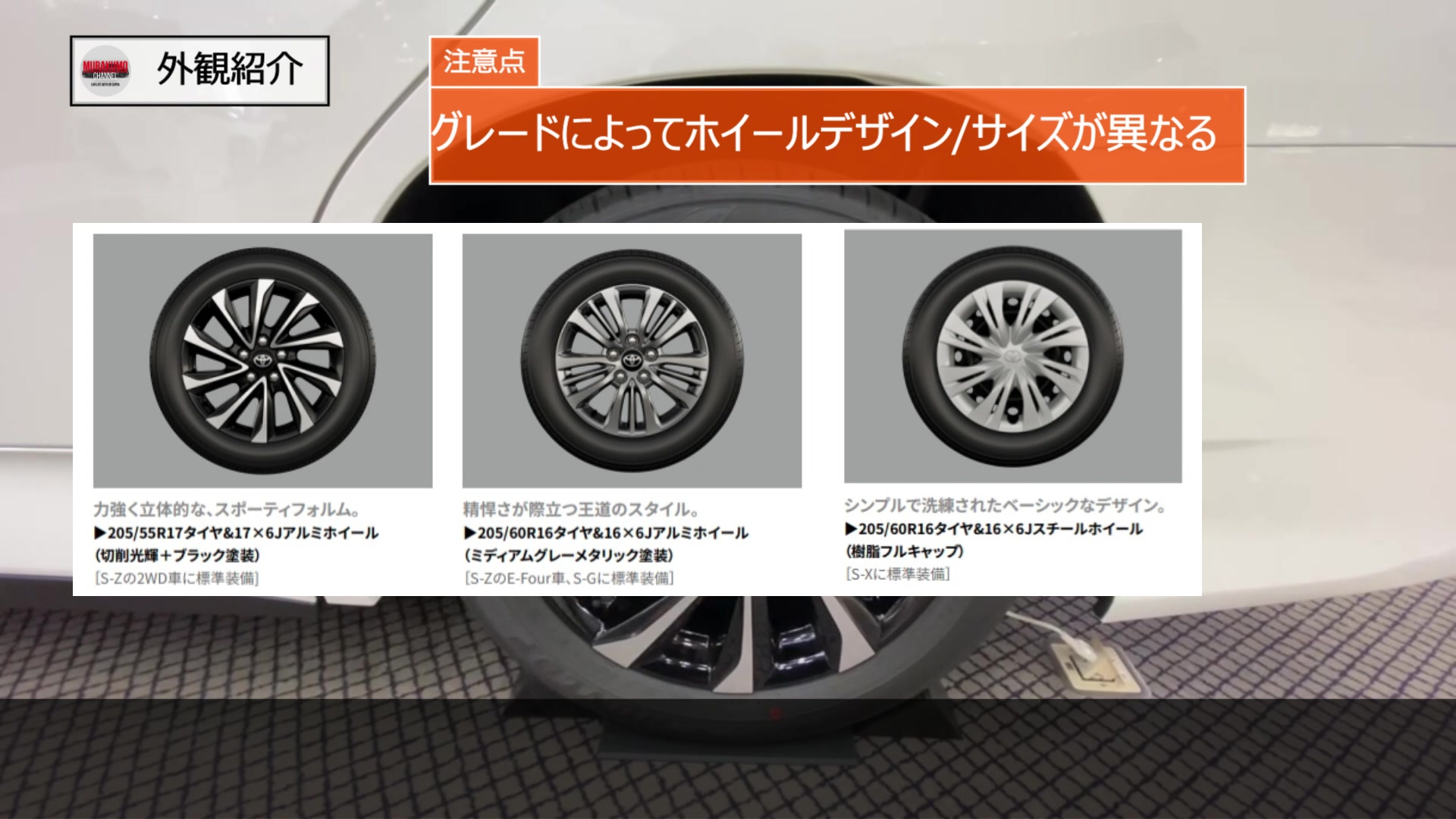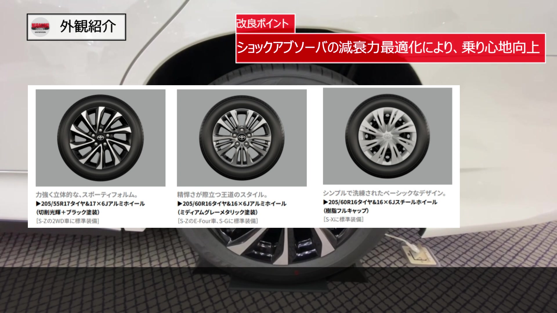 S-ZのFF仕様には17インチアルミホイールが装着され、最もスポーティなデザインとなっています。S-GグレードおよびS-ZのE-Four車にはミディアムグレーメタリック塗装の16インチアルミホイールがS-Xグレードには16インチスチールホイールと樹脂フルキャップが組み合わされます。