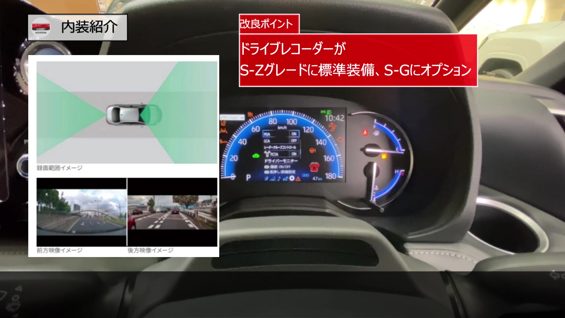 また、今回の改良のタイミングで万一の際の装備として、前後向録画機能を持ったドライブレコーダーがS-Zに標準装備、S-Gにオプション設定されました。