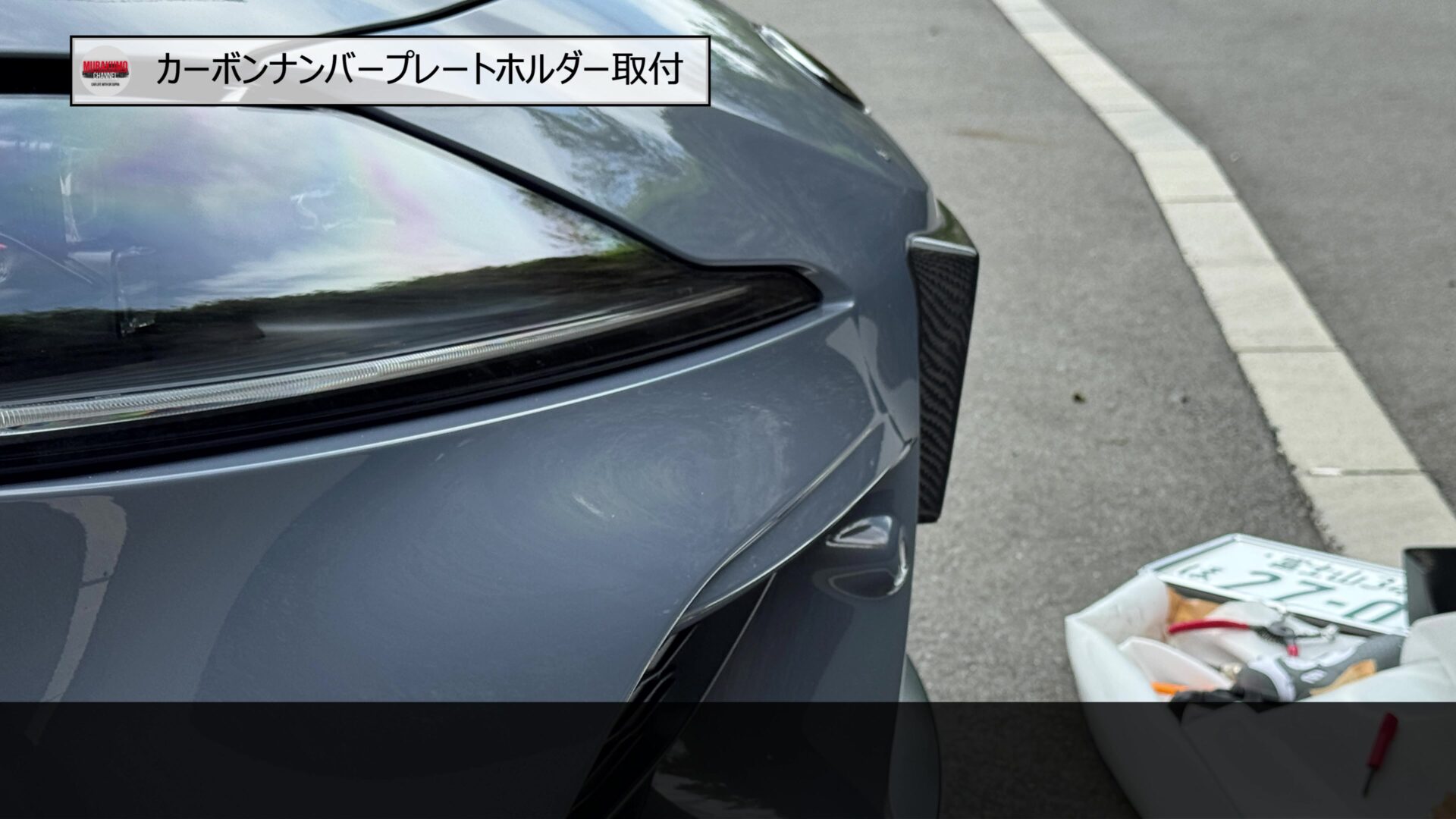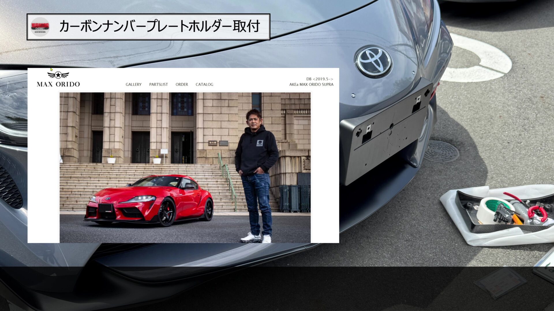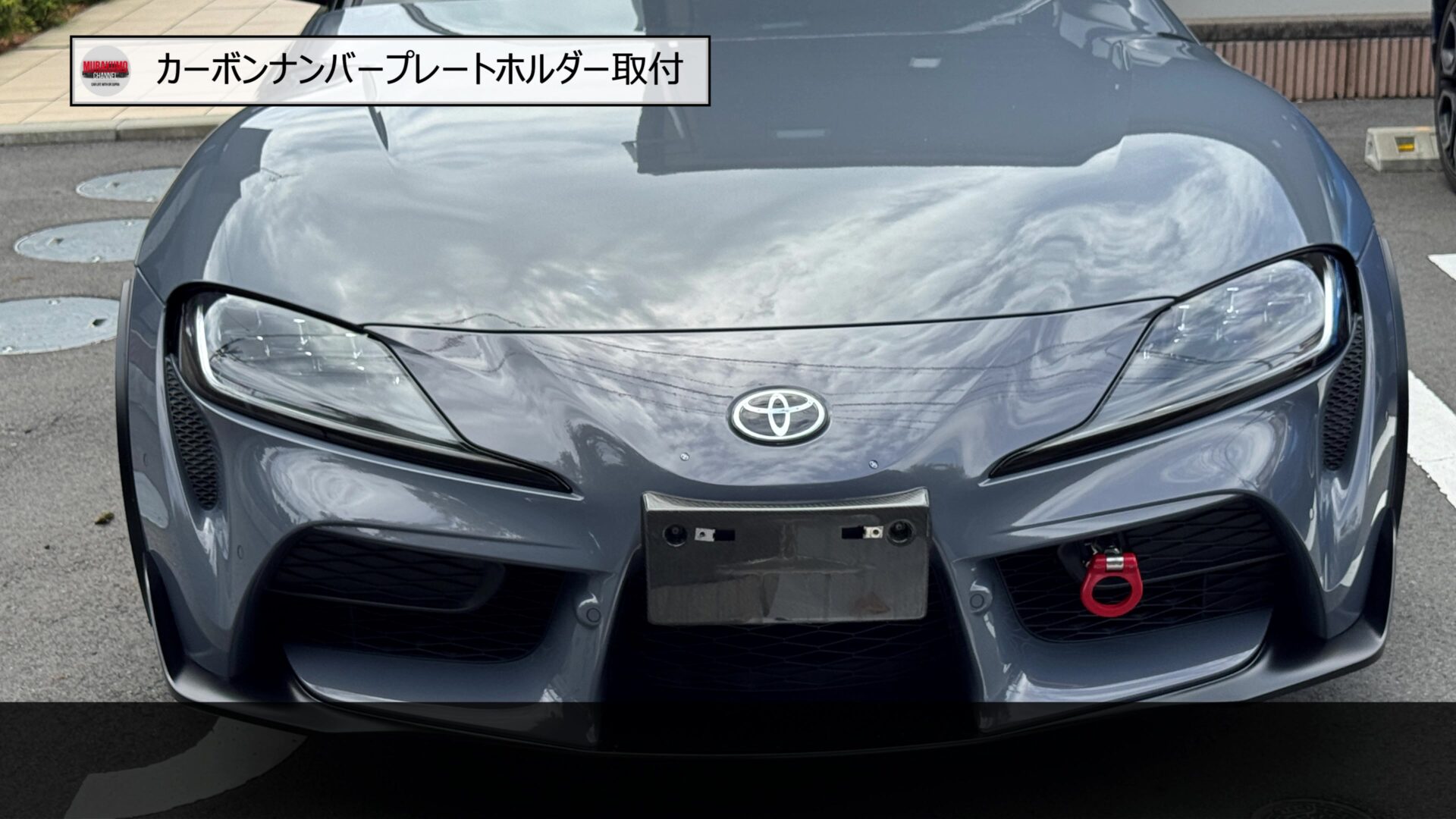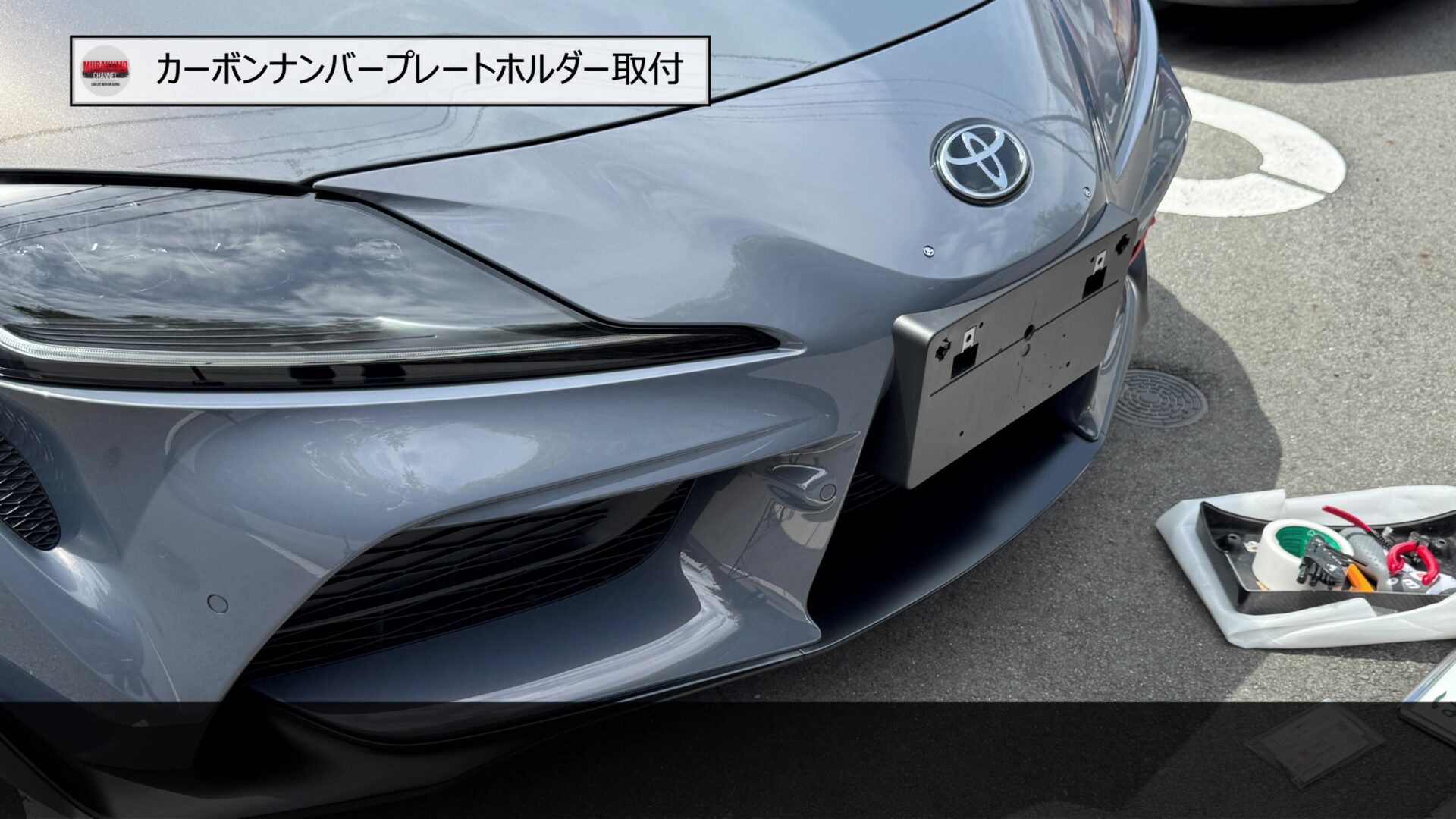 そのため、こちらをみなさんご存じ、MAX織戸さんプロデュースのナンバープレートホルダーに変更します。カーボン素材のため、レーシーな雰囲気であることと、純正品に対して、角度を付けることができるため、スープラのフロントフェース周りをよりシャープにすることができます。