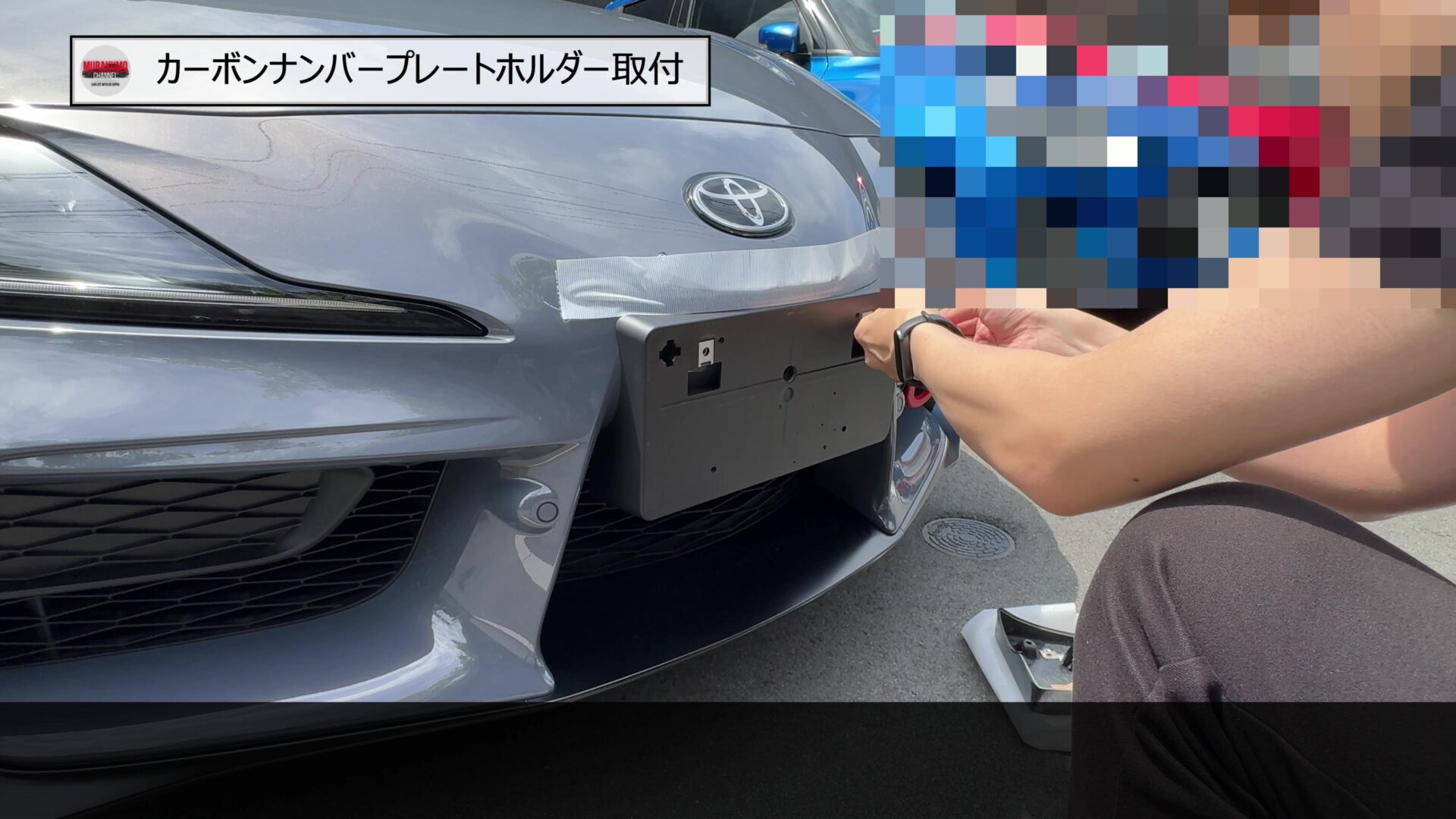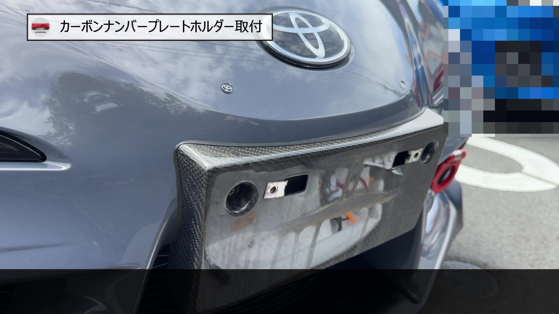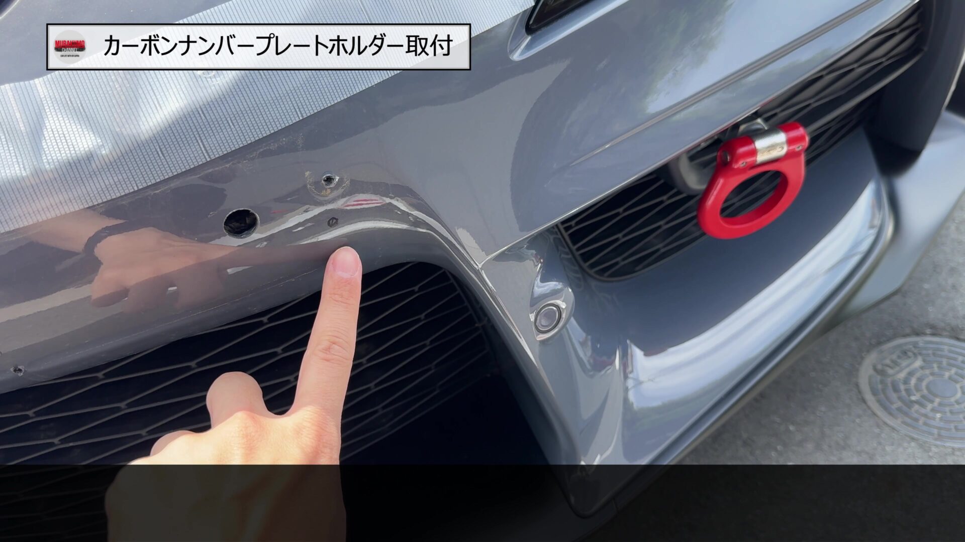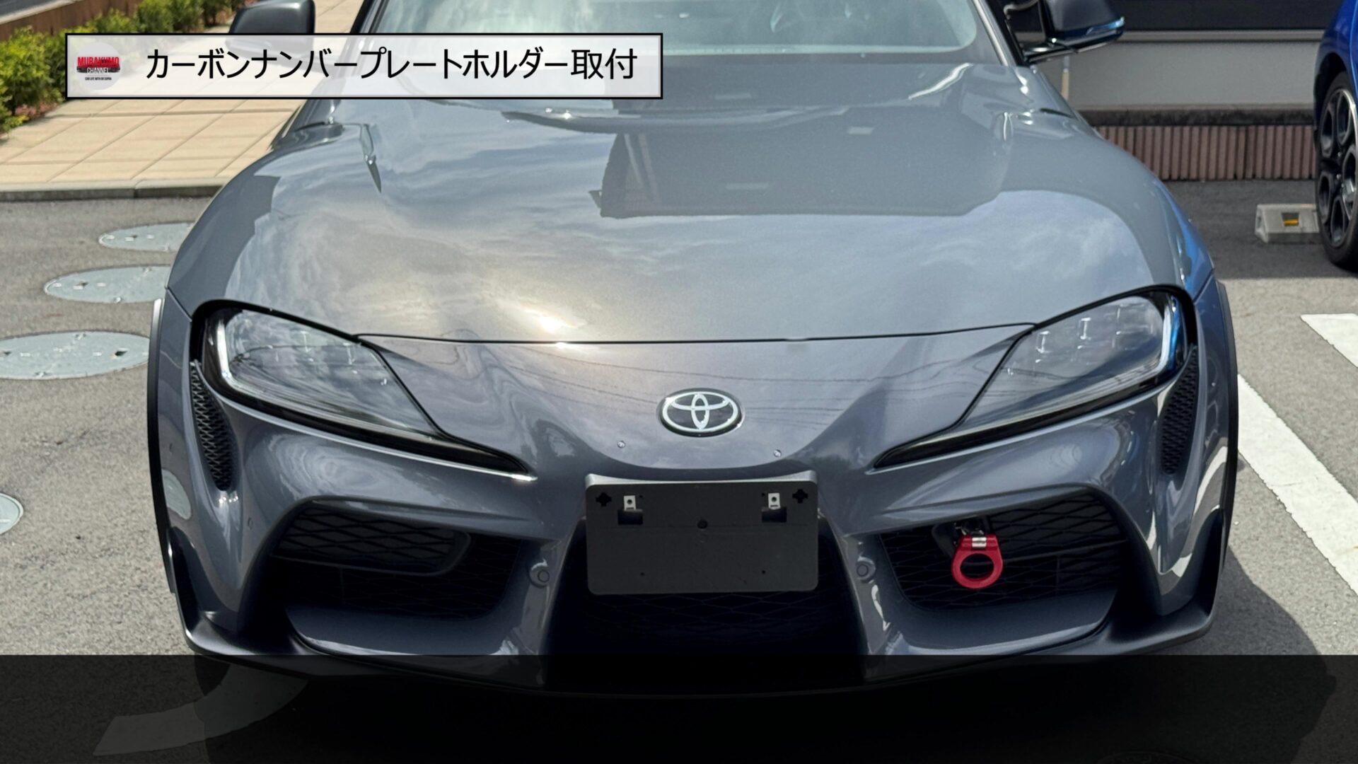 そのため、こちらをみなさんご存じ、MAX織戸さんプロデュースのナンバープレートホルダーに変更します。カーボン素材のため、レーシーな雰囲気であることと、純正品に対して、角度を付けることができるため、スープラのフロントフェース周りをよりシャープにすることができます。