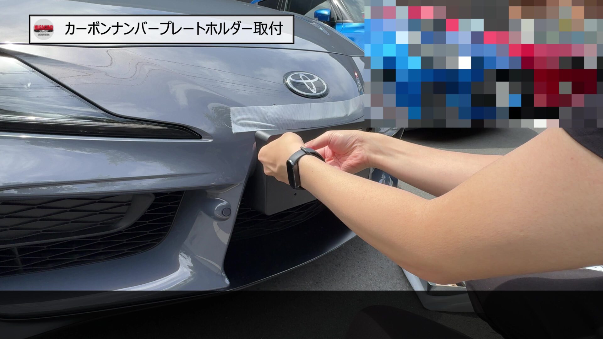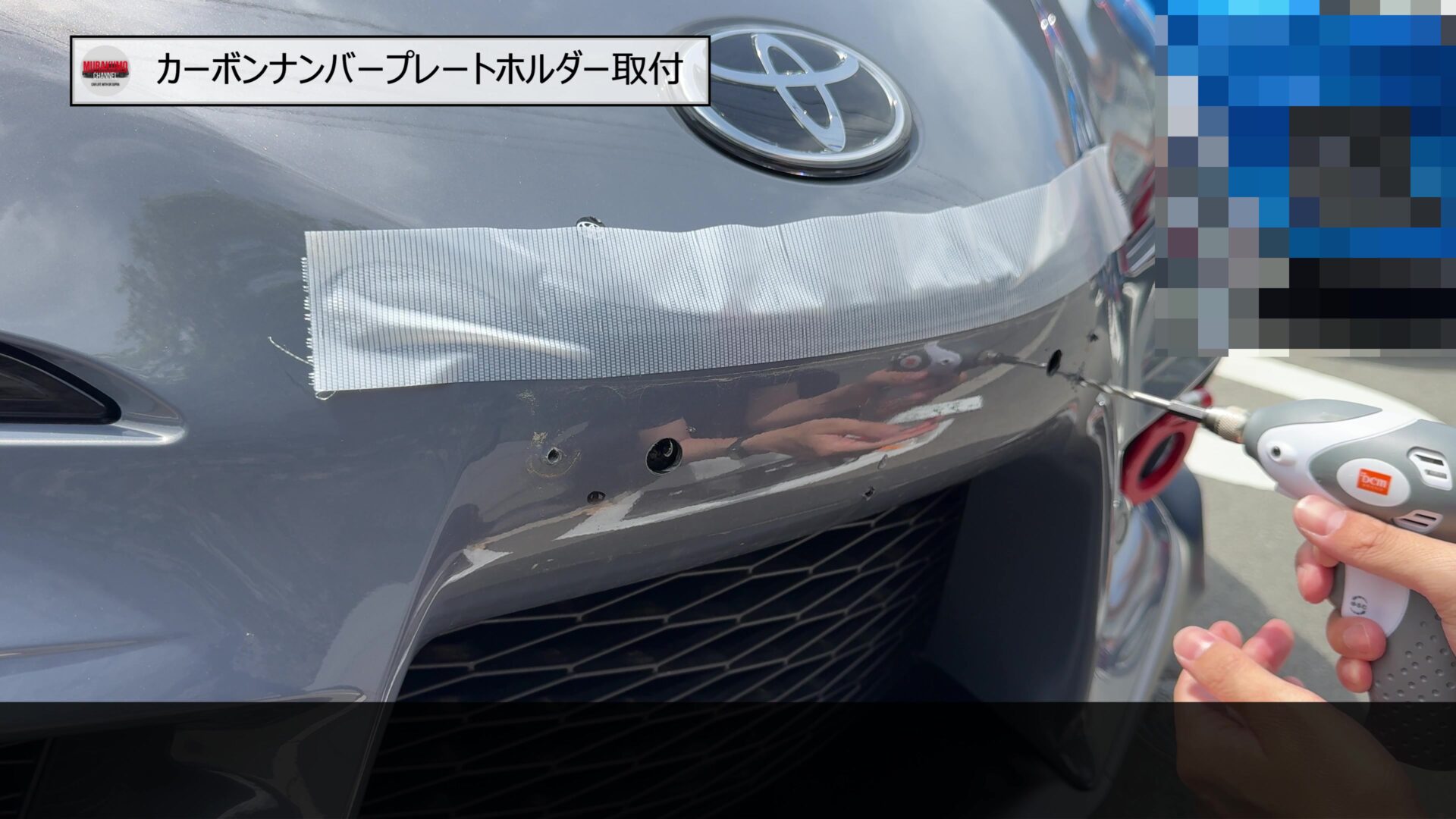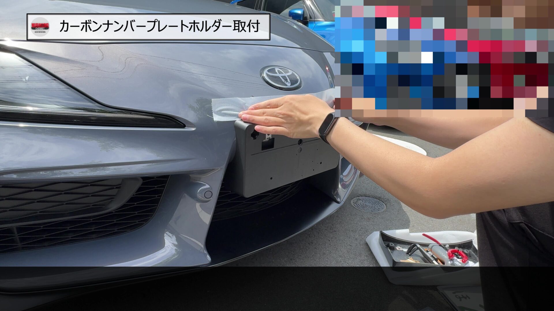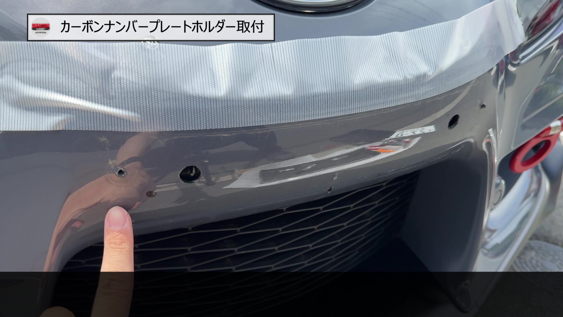 そのため、こちらをみなさんご存じ、MAX織戸さんプロデュースのナンバープレートホルダーに変更します。カーボン素材のため、レーシーな雰囲気であることと、純正品に対して、角度を付けることができるため、スープラのフロントフェース周りをよりシャープにすることができます。