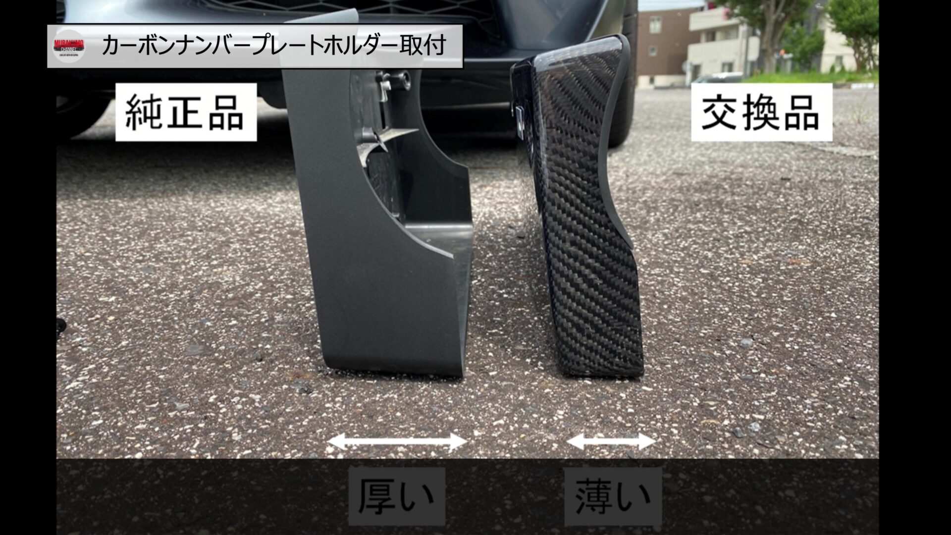 こちらが純正品と社外品の比較となっており、右の社外品は本体が薄く、よりボディにフィットしやすい形状が特徴であり、これにより、ボディに沿った角度をつけやすくなっています。またカーボン柄なので、純正品と比較して、かなりレーシーな雰囲気となっています。