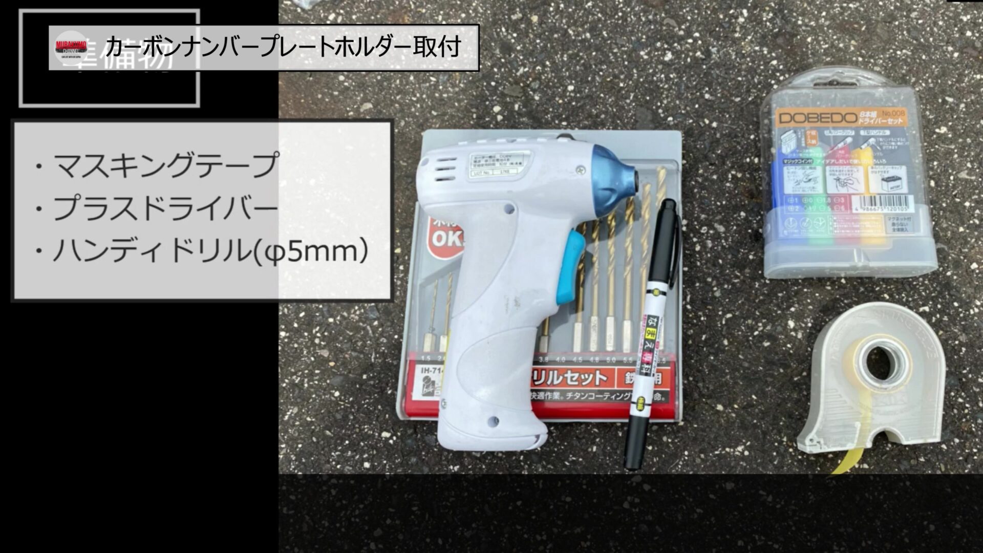 準備物としてはご覧の通りとなっており、位置合わせのマスキングテープとプラスドライバー、社外品を取り付けるための穴開け用のφ5mmのハンディドリルが必要となります。